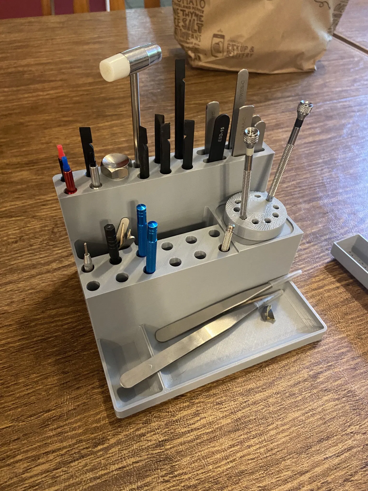 Giá đỡ này rất phù hợp cho nhíp, kẹp kim, tua vít nhỏ, tăm, bao tay, rodico, dụng cụ lò xo, dụng cụ ép tay, dầu bôi trơn, spudgers, v.v. Nó có một ngăn nhỏ ở phía trước để chứa các công cụ hoặc bộ phận đang sử dụng. Tuyệt vời cho thợ đồng hồ hoặc thợ làm mô hình.
