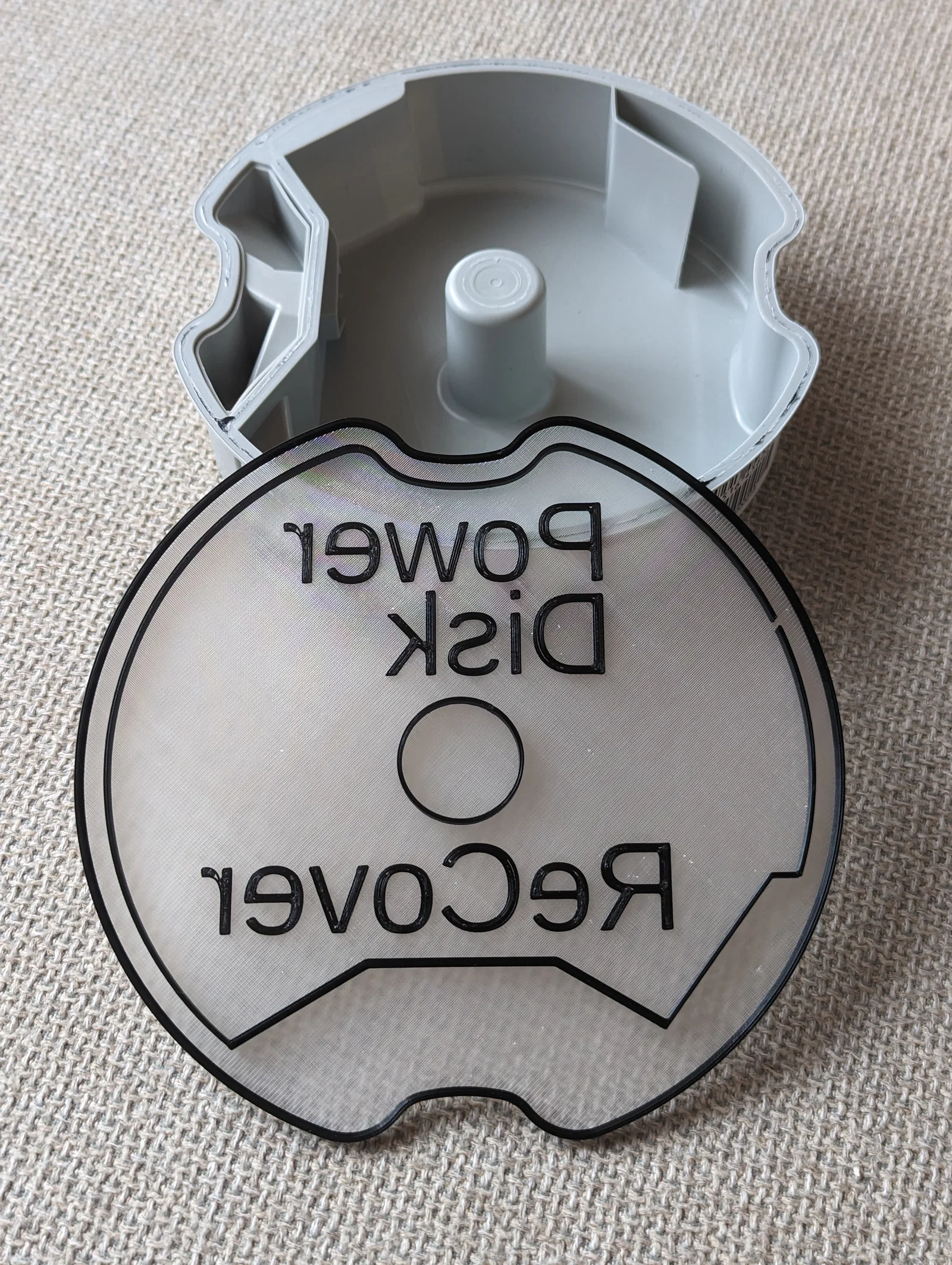 Nắp PowerDisk ReCover giúp bạn mở/đóng lại hộp chất tẩy rửa PowerDisk cho máy rửa chén Miele AutoDos khi lớp foil bị hư. Khuyến nghị in 0.2mm, fit rất khít; có kèm OpenSCAD để chỉnh tolerance.