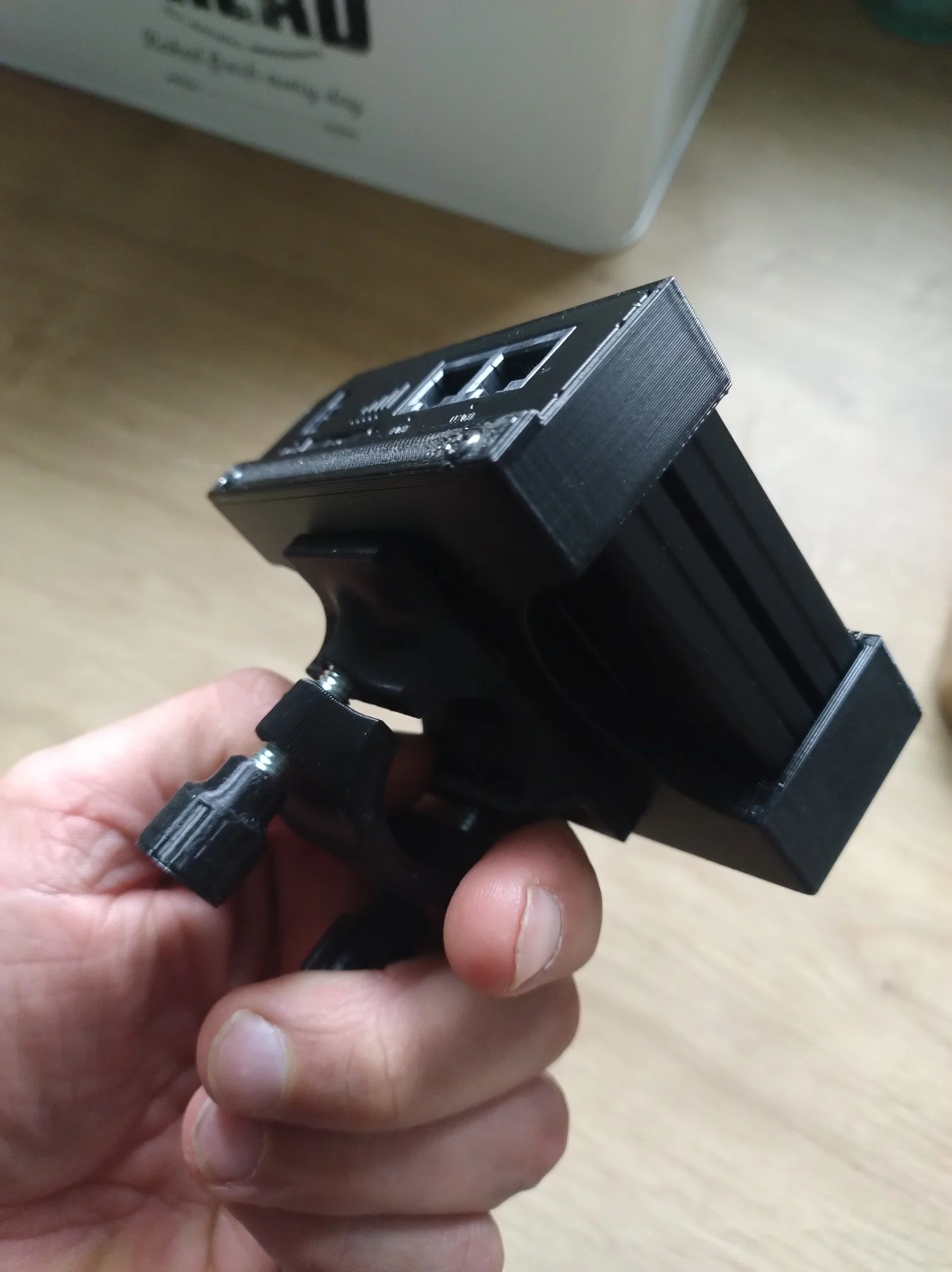 Phần ngàm kẹp: chuẩn bị 2 bu lông M6x50 kèm ê-cu. Khi in file vis.3mf, canh pause để nhét ê-cu vào, nhựa sẽ khép nhẹ phía trên ê-cu để tạo lực hãm (chống tuột).