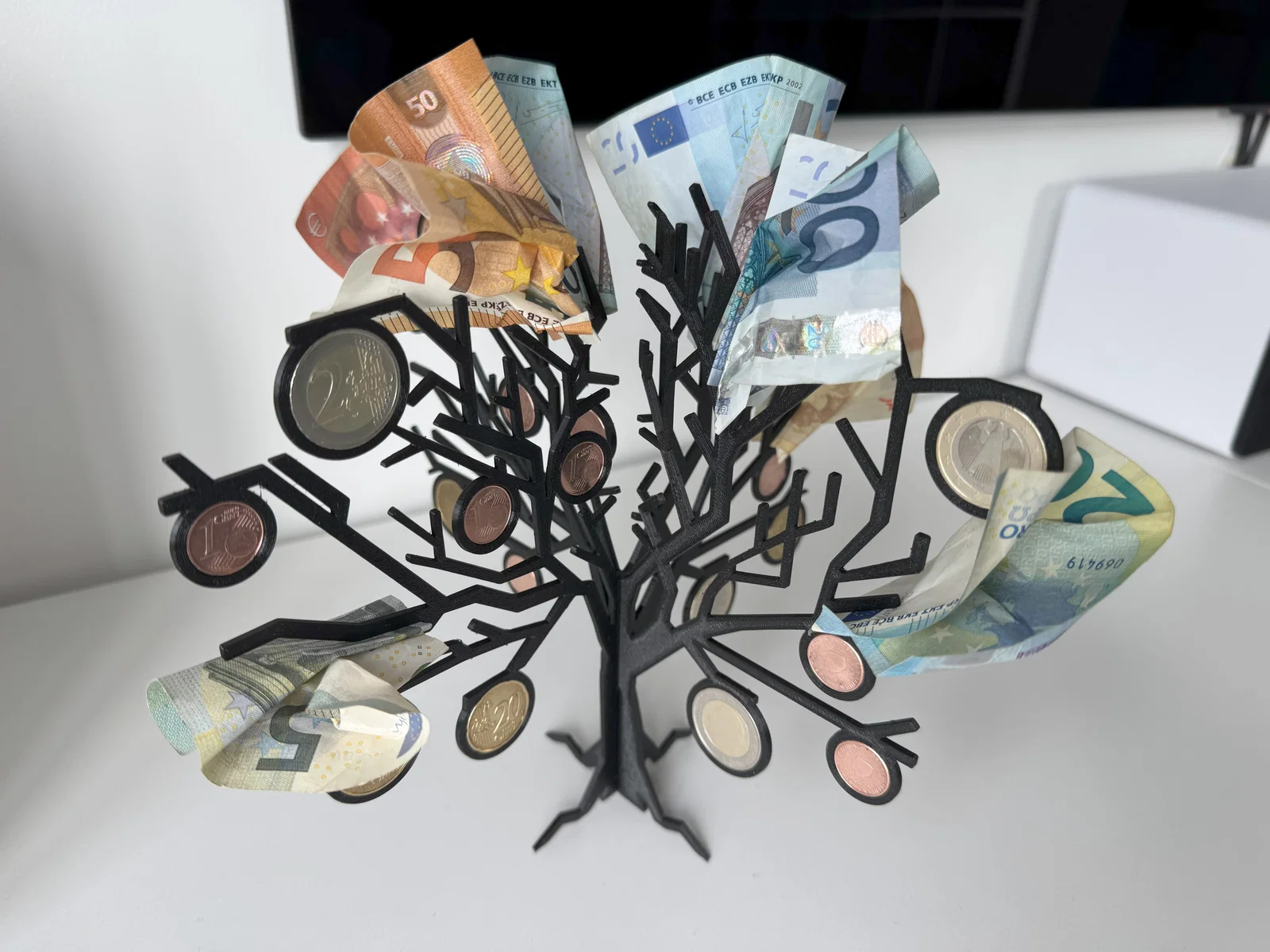 Mẫu Money Tree – cây tiền để làm quà tặng. Thiết kế có chỗ gắn cả đồng xu lẫn tiền giấy; lỗ đồng xu theo đường kính euro với độ dôi 0.03mm cho fit ma sát chắc. Có kèm file STEP để chỉnh theo tiền tệ khác.