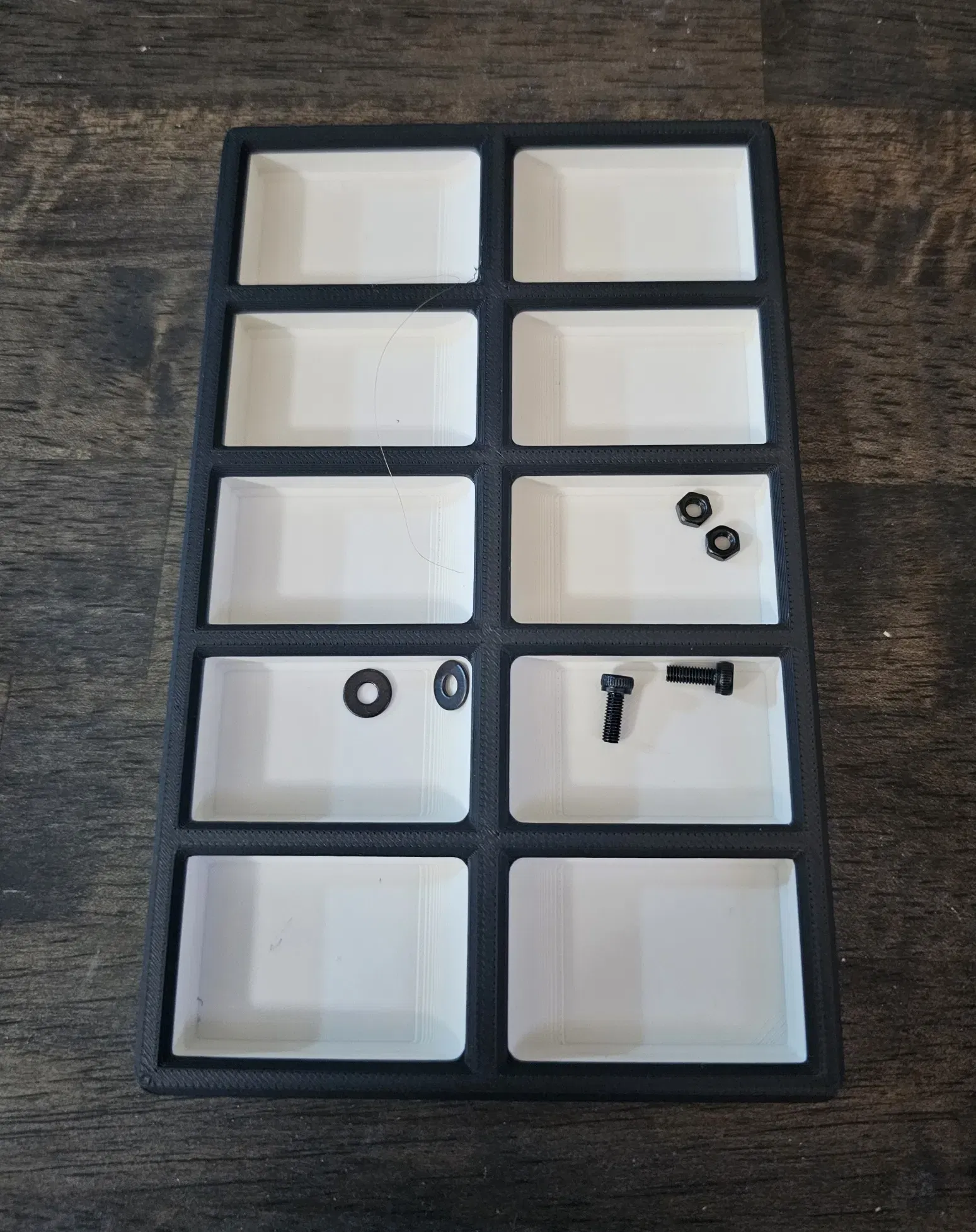 Một khay phụ kiện đơn giản với rãnh ở giữa để dễ dàng lấy các bộ phận nhỏ mà không lo chúng rơi xuống sàn.