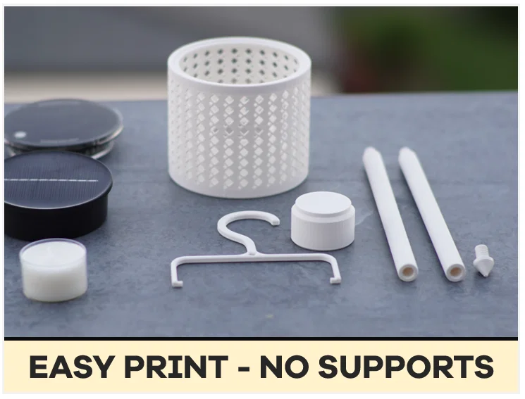 Mẫu đèn modular dễ in, dùng linh hoạt cho camping, bãi biển, ngoài trời hoặc trong nhà. Hỗ trợ dùng đèn solar LED tiêu chuẩn hoặc tea light; có thể treo, cắm xuống cát/đất hay đặt bàn, tạo bóng đổ đẹp.