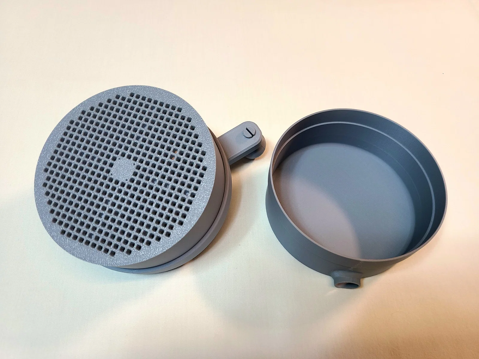 Dụng cụ in 3D giúp tuốt và tách hạt húng quế khỏi trấu nhanh gọn: cho pod vào, đậy nắp rồi quay tay—hạt rơi xuống hộp hứng qua rây. Thiết kế dung sai để nghiền pod và lọc hạt hiệu quả.