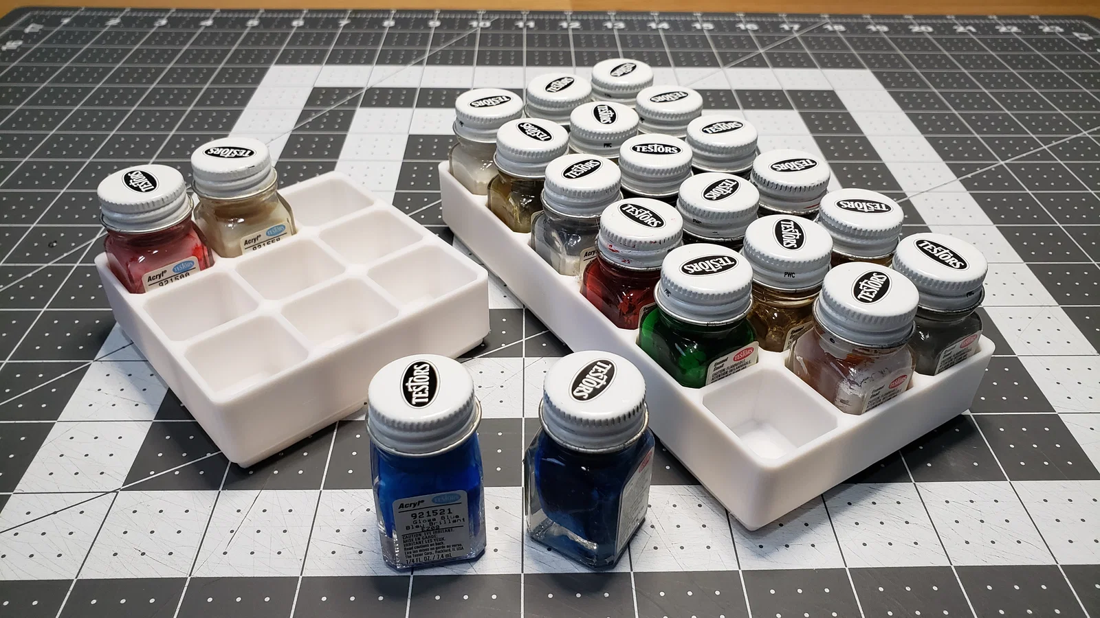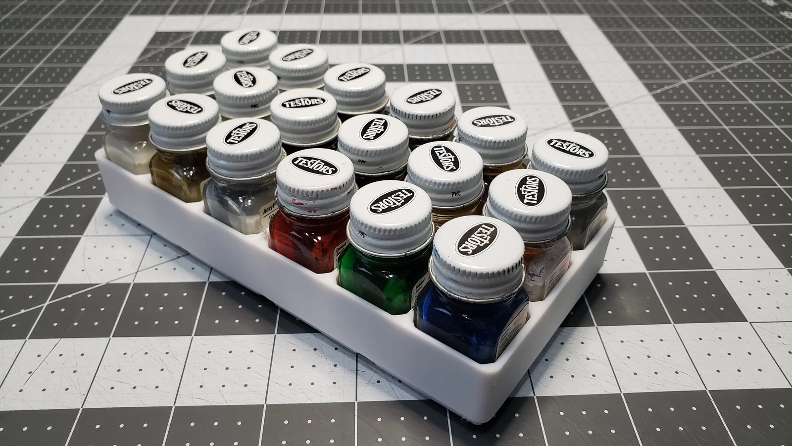 Một khay Gridfinity được làm riêng để chứa sơn mô hình Testors. Có sẵn các lỗ ở góc để gắn nam châm nếu bạn muốn.