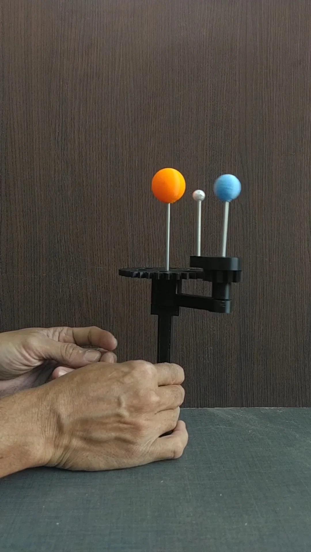 Mô hình cầm tay giúp mô phỏng chuyển động tự quay và chuyển động quay quanh của Trái Đất và Mặt Trăng quanh Mặt Trời. In 3 chi tiết (cam/xanh dương/trắng) và dùng thanh kim loại 2mm, 3mm làm trục; cần support cho phần hình cầu.