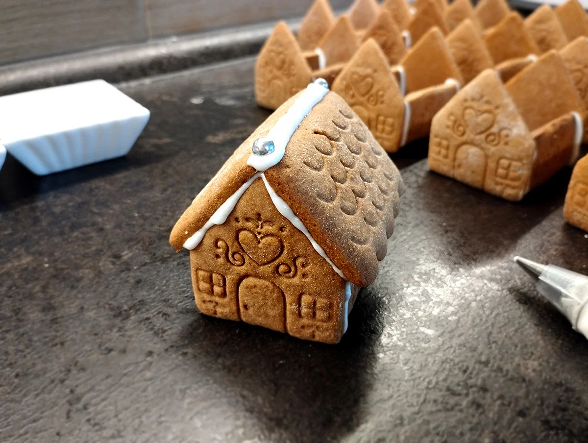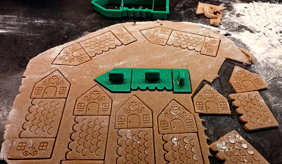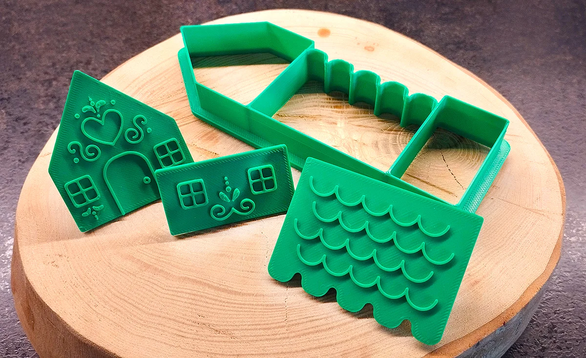 Bộ Tiny Gingerbread House gồm cookie cutter và stamp để làm bánh ngôi nhà gingerbread mini. Có hướng dẫn in 3D (brim, dán tay cầm bằng superglue) và các bước cán bột, dập stamp, nướng rồi ráp bằng royal icing.
