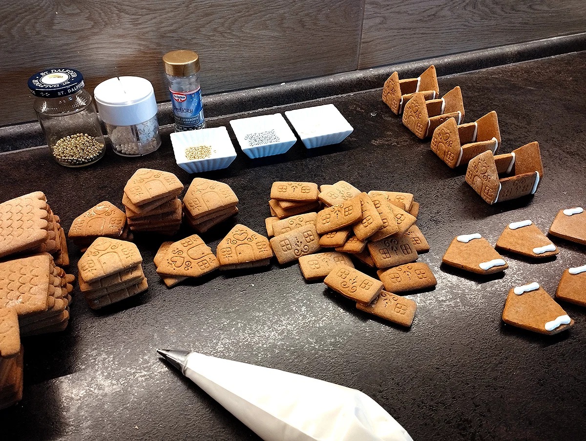• dùng royal icing để ráp ngôi nhà lại
