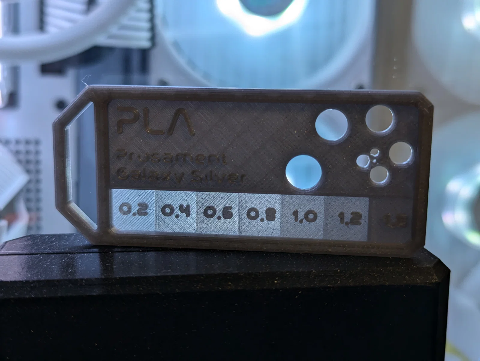 Phiên bản mẫu filament có bậc thang layer height, lỗ theo tỷ lệ vàng và nhãn có thể chỉnh sửa ngay trong Prusa Slicer. Phù hợp làm thẻ swatch để ghi loại, hãng và màu filament.
