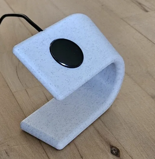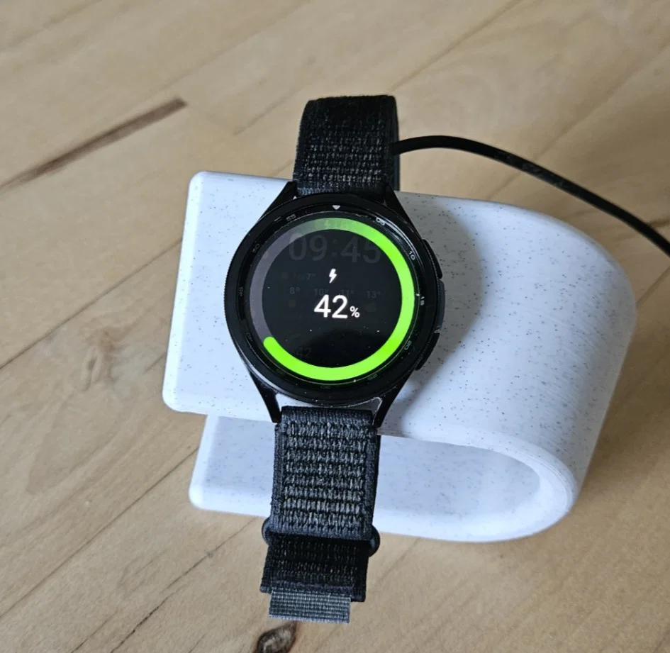 Chân đế sạc cho Samsung Galaxy Watch, mình thiết kế cho Watch 6 Classic (có thể dùng cho các mẫu khác). Phần plug STL nên in 95–97% tùy filament để cố định đầu sạc, tránh phải dán keo.