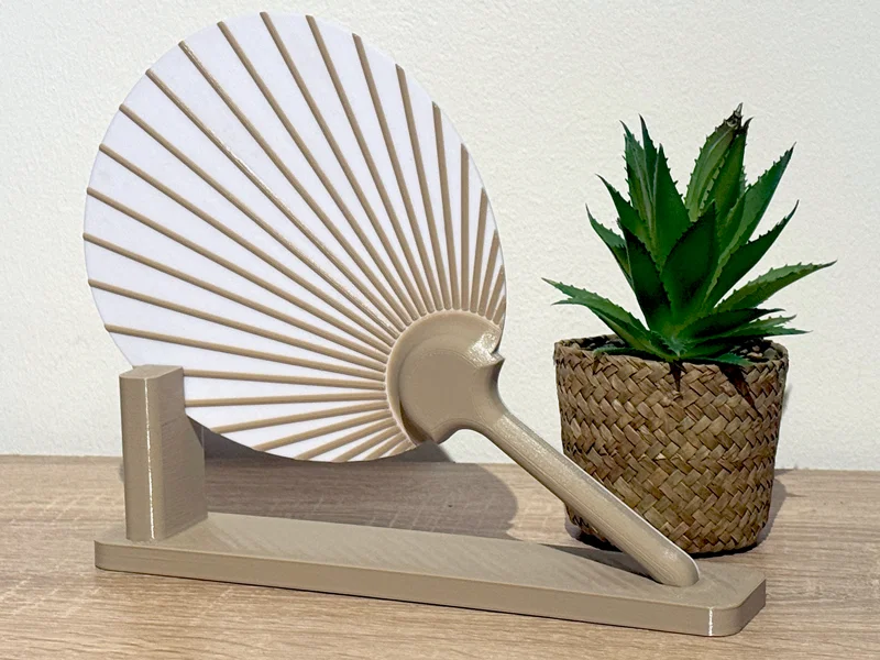 Mẫu quạt tay Japanese uchiwa print-in-place, vừa dùng để quạt mát vừa trang trí nhà. Thiết kế nhẹ, dáng tròn dẹt truyền thống, không cần supports. Khuyến nghị layer 0.15 mm, infill 15%, đổi màu ở layer 13; dùng PETG để dẻo hơn.