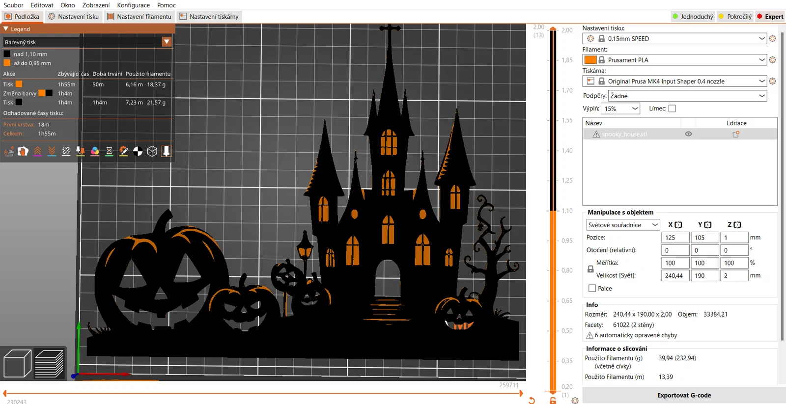 Sản phẩm này được thiết kế theo dạng nghệ thuật treo tường phẳng, rất phù hợp để gắn lên các bề mặt phẳng hoặc đặt trên kệ trang trí. Điểm đặc biệt của mô hình là kỹ thuật in hai màu, cho phép bạn tạo ra độ tương phản ấn tượng giữa các chi tiết như cửa sổ, thân nhà và hình ảnh bí ngô. Nhờ vậy, món đồ trông rất nổi bật và chuyên nghiệp như được mua từ cửa hàng đồ trang trí cao cấp.
