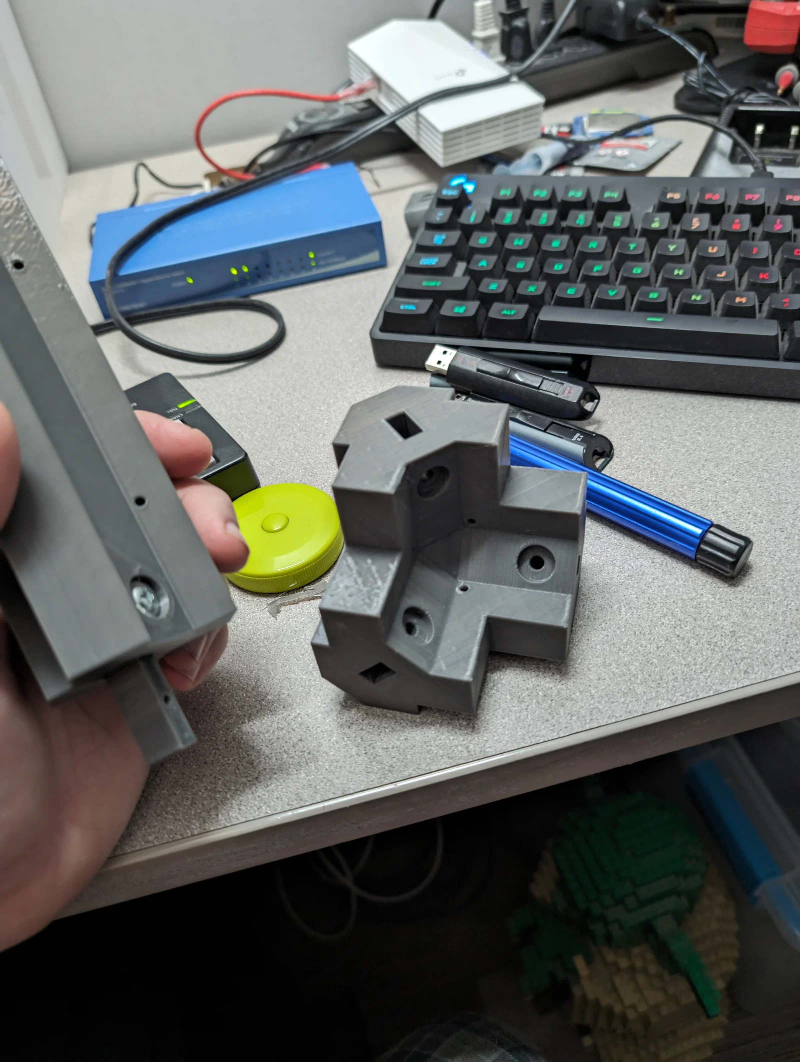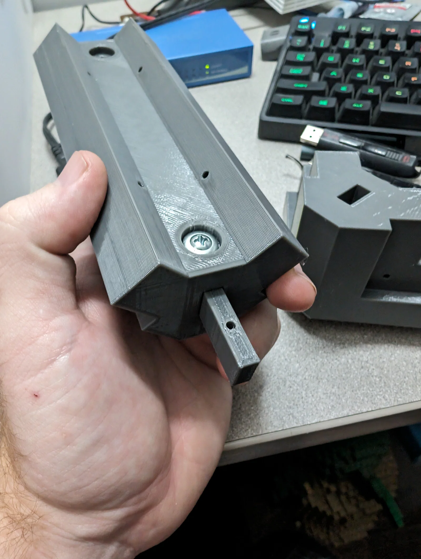 Hiện tại mình dùng Elegoo Neptune 3, các chi tiết prototype màu xám được in bằng SUNLU PETG. Mình tinh chỉnh từ profile “Extra Fast” mặc định của Cura slicer (không phải bản Cura của Elegoo): mình set wall count = 4. Infill (pattern honeycomb) đặt 50% cho các chi tiết lớn và 80% cho các chi tiết connector và hinge.