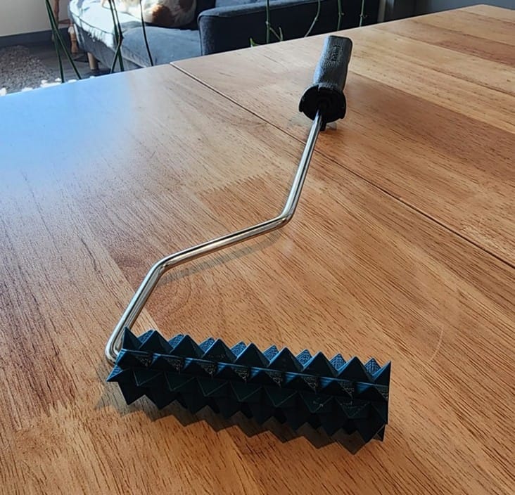 Con lăn gai gắn vừa tay cầm mini paint roller 4.5" tiêu chuẩn, tạo cảm giác “nhột nhột” kiểu spikey khi chơi. In theo setting thường, không cần supports; lớp in mỏng giúp gai sắc hơn.
