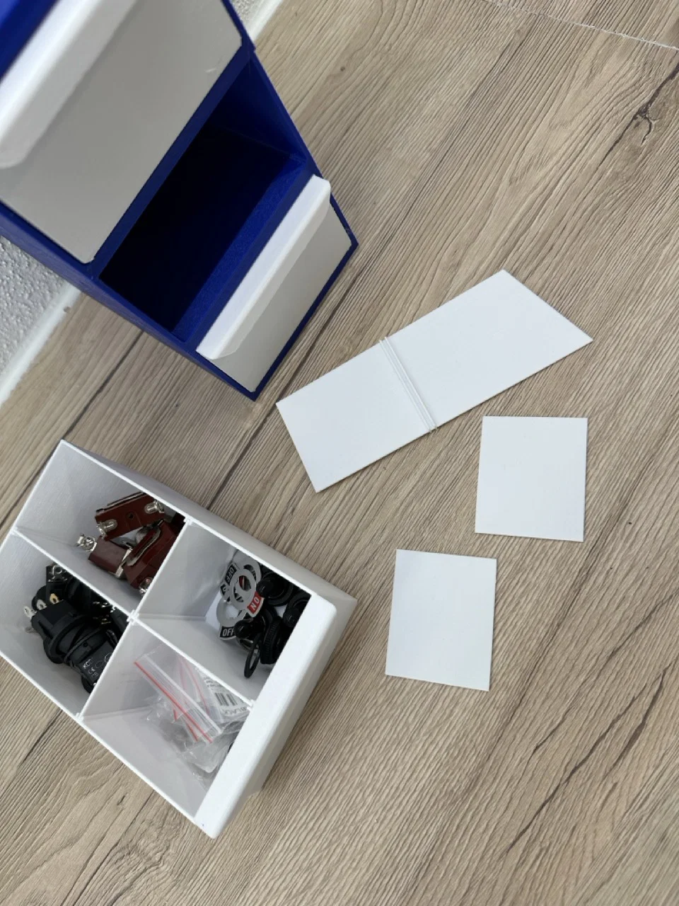 Mẫu ngăn kéo toolbox dạng mô-đun, có thể gài khớp để xếp thành tháp. Có top box cho đẹp, kèm vách ngăn chia 2/3/4 ngăn. Lòng trong 90×145×53mm. In PETG, 5% infill; housing dùng custom support.