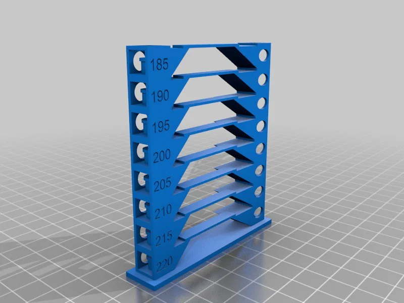 Temperature tower có sẵn nhiều hình để quan sát chất lượng in (ellipse, circle, triangle, squares, cone, pipe). Đế 2mm nên cần canh mốc chiều cao để đổi nhiệt trong slicer. Có phiên bản cho PLA/PLA Plus và PETG.