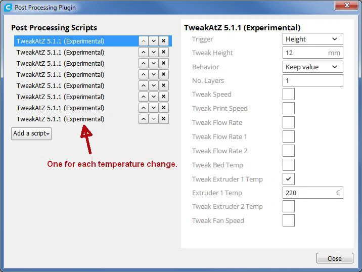 Phần đế dày 2mm, nên nhớ điểm này khi cài đổi nhiệt độ trong slicer. Ví dụ với tháp PLA bắt đầu ở 220C thì bạn in ở nhiệt đó cho tới khi chiều cao layer đạt 12 mm rồi cho đổi xuống 215C. Sau đó tới 22 mm thì đổi xuống 210C, cứ vậy tiếp tục.