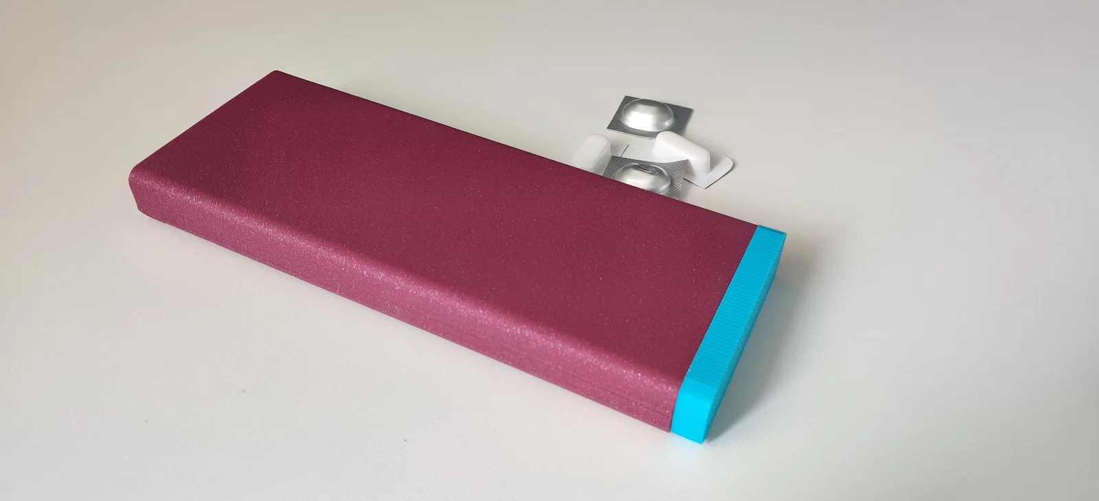 Hộp đựng thuốc cỡ vừa theo tuần, mỗi ngày chia ngăn sáng/tối, kèm thêm khoang để đồ dùng hằng ngày như thuốc dị ứng hay giảm đau. Nắp dùng snap-fit khít; có hướng dẫn in, supports và xử lý chà nhám khi quá chặt.