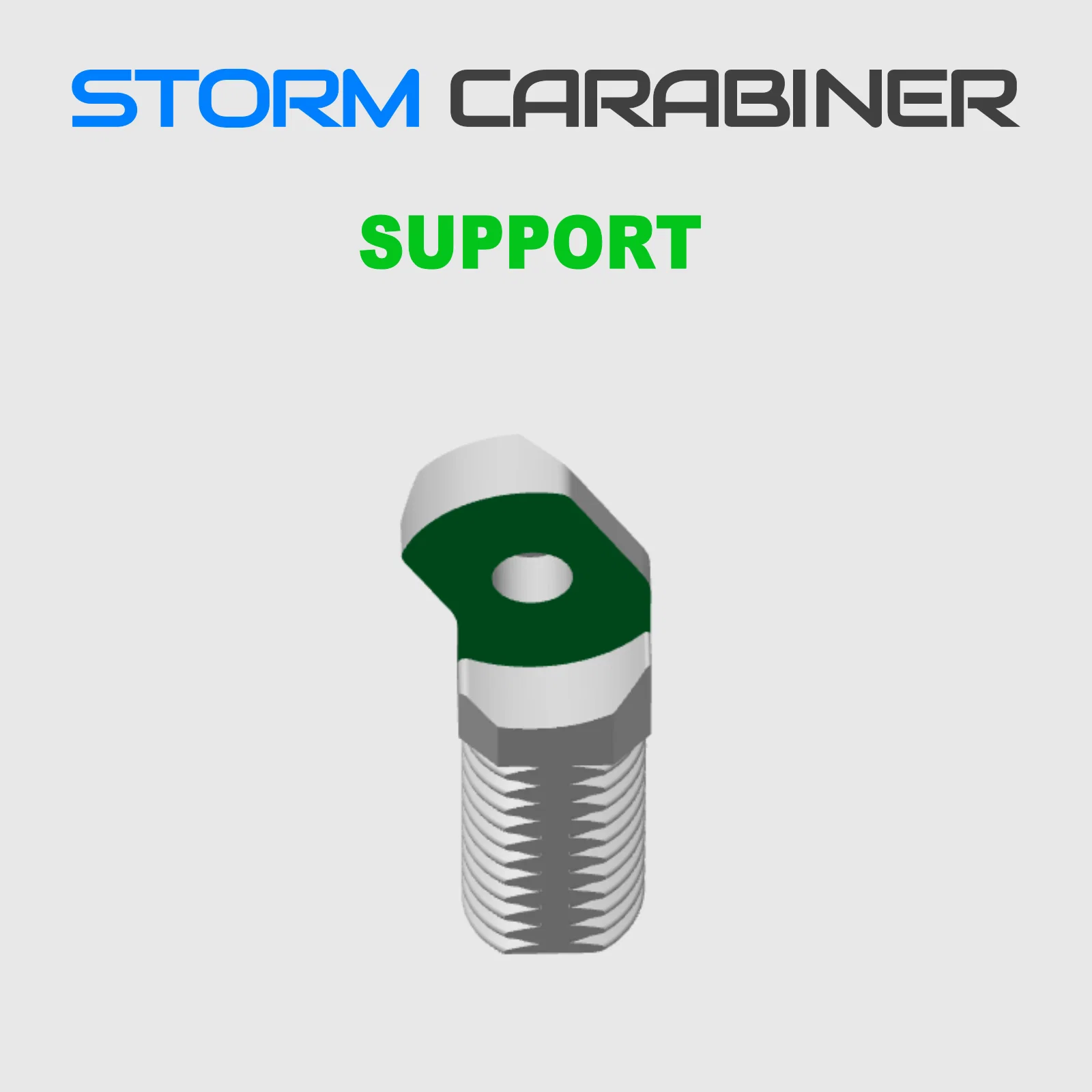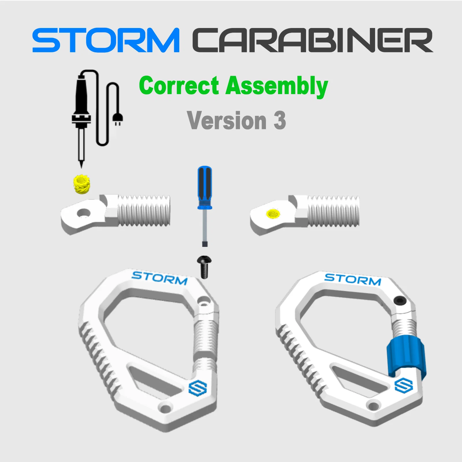 Storm Carabiner có khóa, 100% printed với 3 phiên bản lắp ráp: chốt in hoặc dùng ốc M3 (tùy bản có thêm Heat Threaded Insert). Có lỗ gắn dây 2–3mm, kèm file STL/3MF (in màu hoặc 1 màu).
