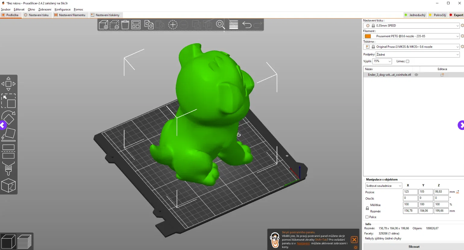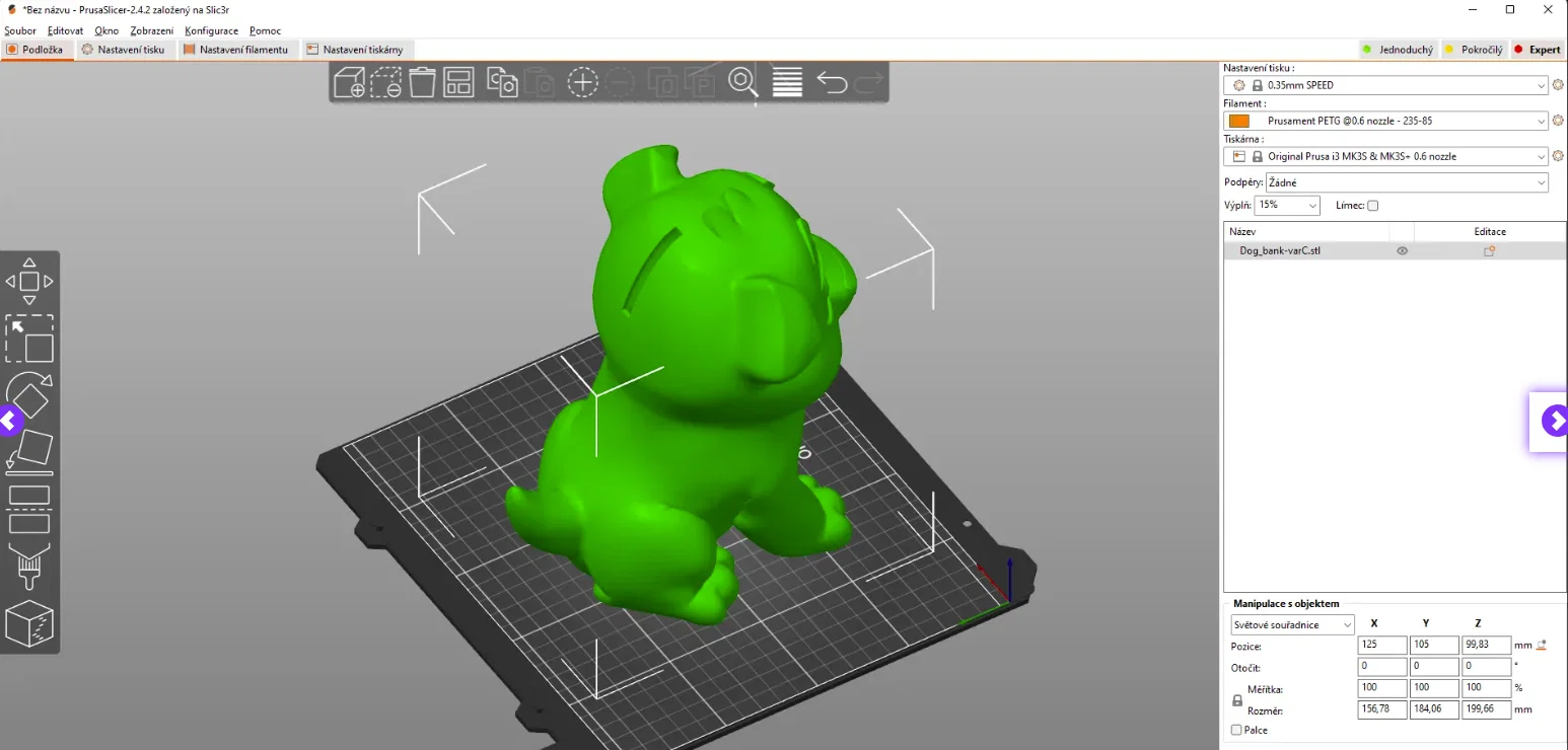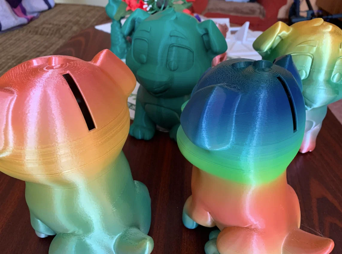 Chó Makerbot (hoặc Creality). Đã resize lên 176 mm. Bạn có thể đổi kích thước, nhưng nhớ chỉnh cùng tỉ lệ cho phần nắp đáy. Mẫu rỗng với vỏ dày 2mm. Phía dưới là nắp để lấy xu/tiền bên trong, phía trên có khe để bỏ xu. Bạn cũng có thể in chỉ phần thân (không có khe bỏ xu), chỉ là con chó.