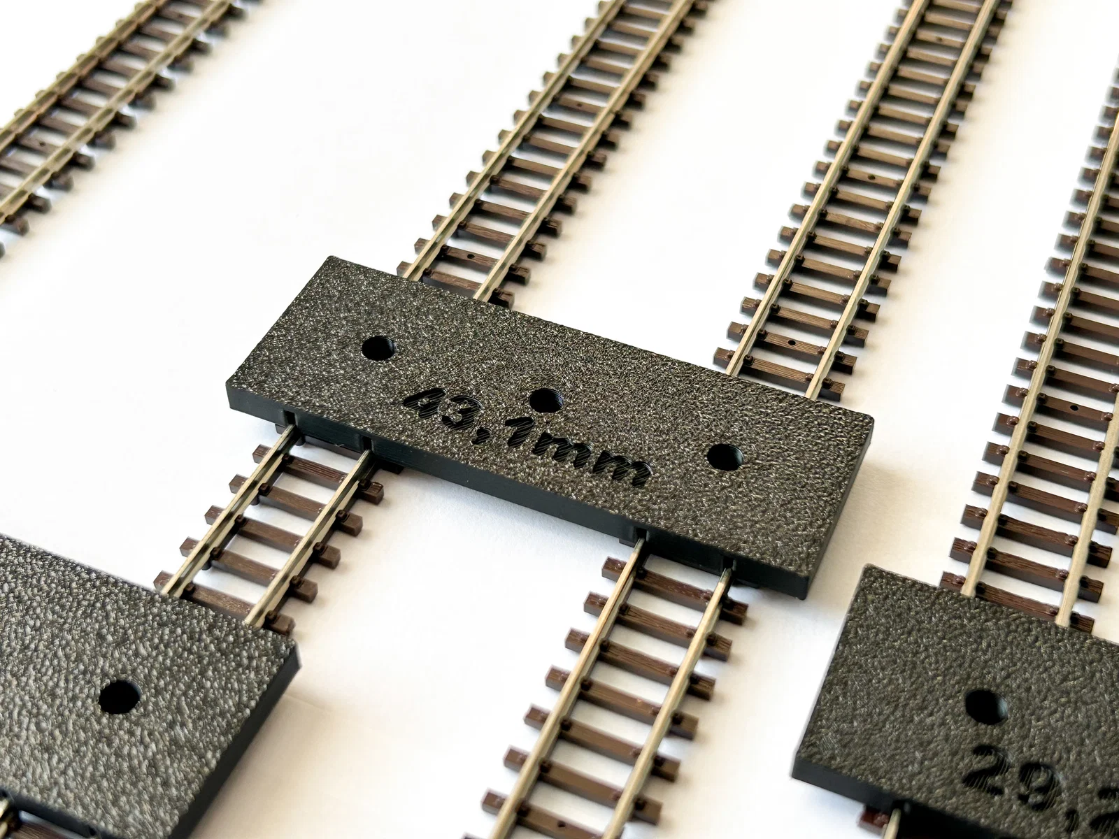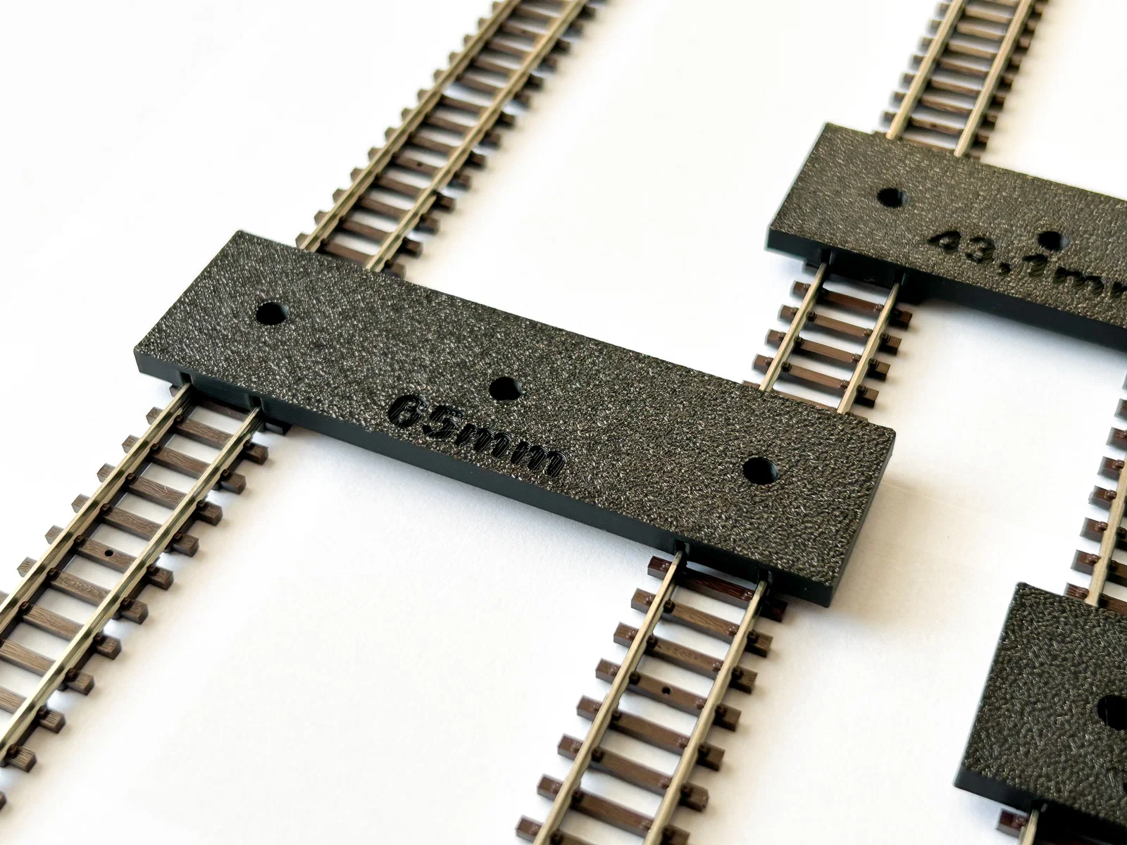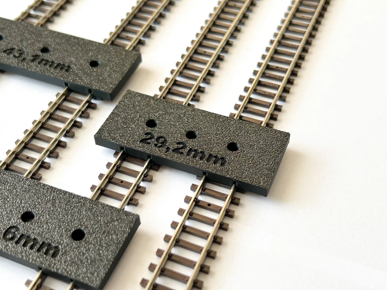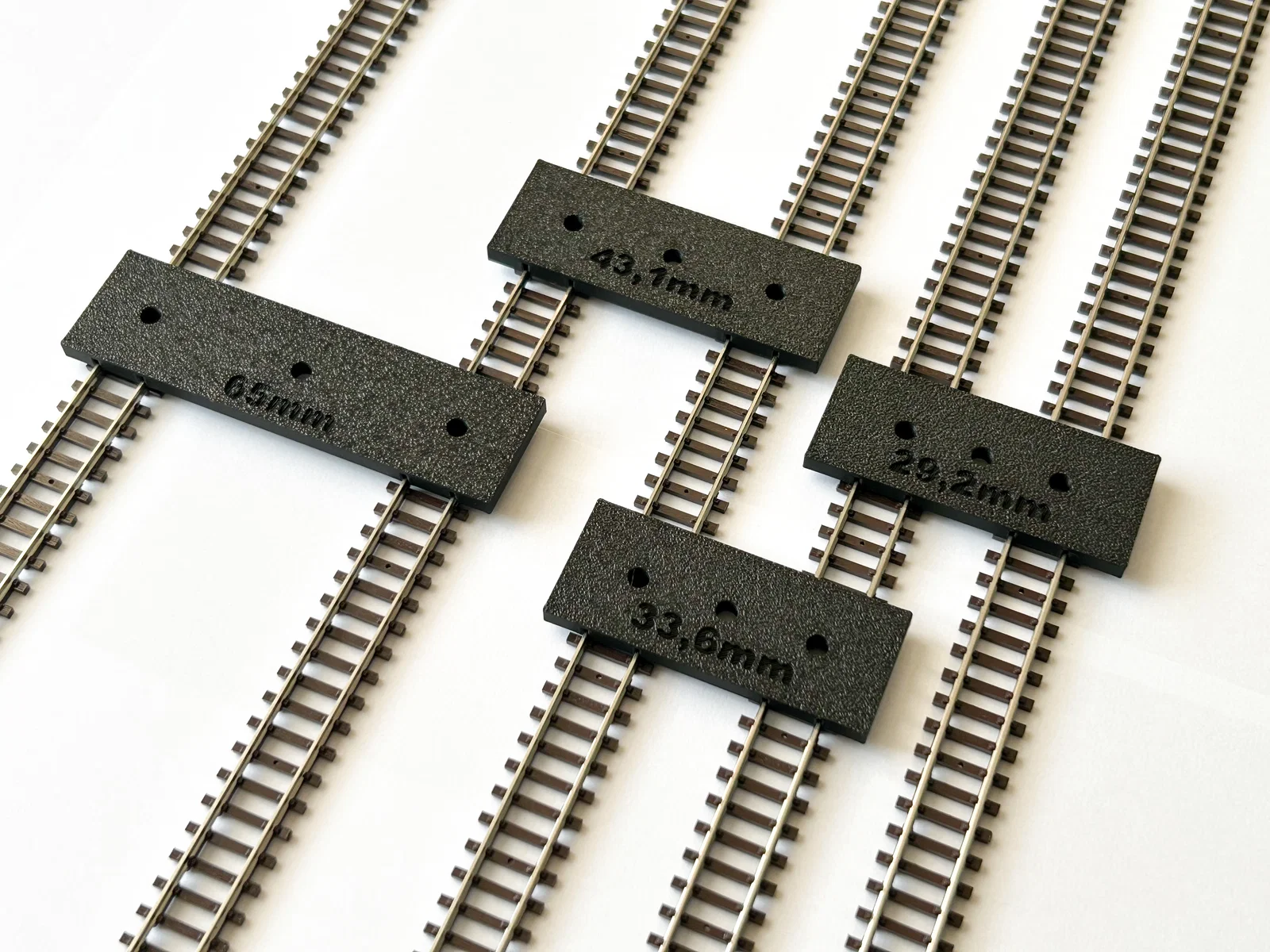 Việc sử dụng các công cụ này rất đơn giản. Bạn chỉ cần đặt thước lên giữa hai đoạn đường ray cần căn chỉnh, các rãnh định vị của thước sẽ khớp hoàn hảo vào ray, đảm bảo khoảng cách cố định theo thông số in sẵn như 65mm, 43,1mm, 33,6mm hay 29,2mm. Nhờ đó, ngay cả những đoạn đường ray phức tạp hay các đoạn cua cũng có thể được lắp đặt một cách đồng bộ và chuyên nghiệp hơn rất nhiều.