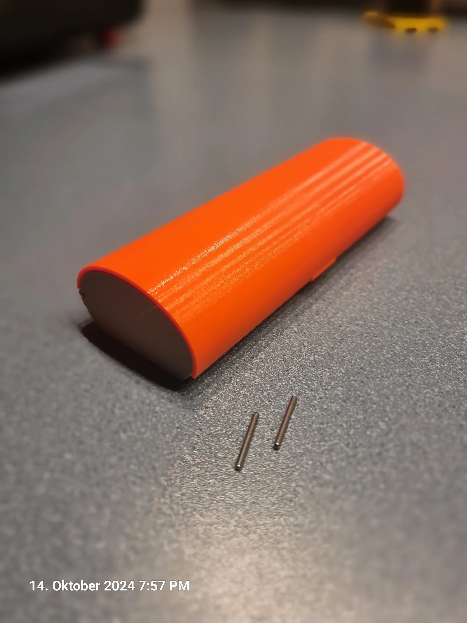 Mẫu này được in trên máy Prusa MK4S với đầu phun 0.4, sử dụng nhựa PETG. Đối với phần đế, bạn không cần dùng cấu trúc hỗ trợ (support). Đối với phần nắp, tôi đã in theo chiều đứng và có bật chế độ "support". Để làm phần bản lề, bạn cần chuẩn bị 2 chốt 20x2mm (xem hình) có thể dễ dàng mua trên mạng. Nếu cần, bạn có thể dùng mũi khoan 2mm để chỉnh lại các lỗ cho chốt lắp vào vừa vặn. Ngoài ra, bạn có thể dán thêm nhung hoặc nỉ vào mặt trong của hộp tùy theo sở thích cá nhân.