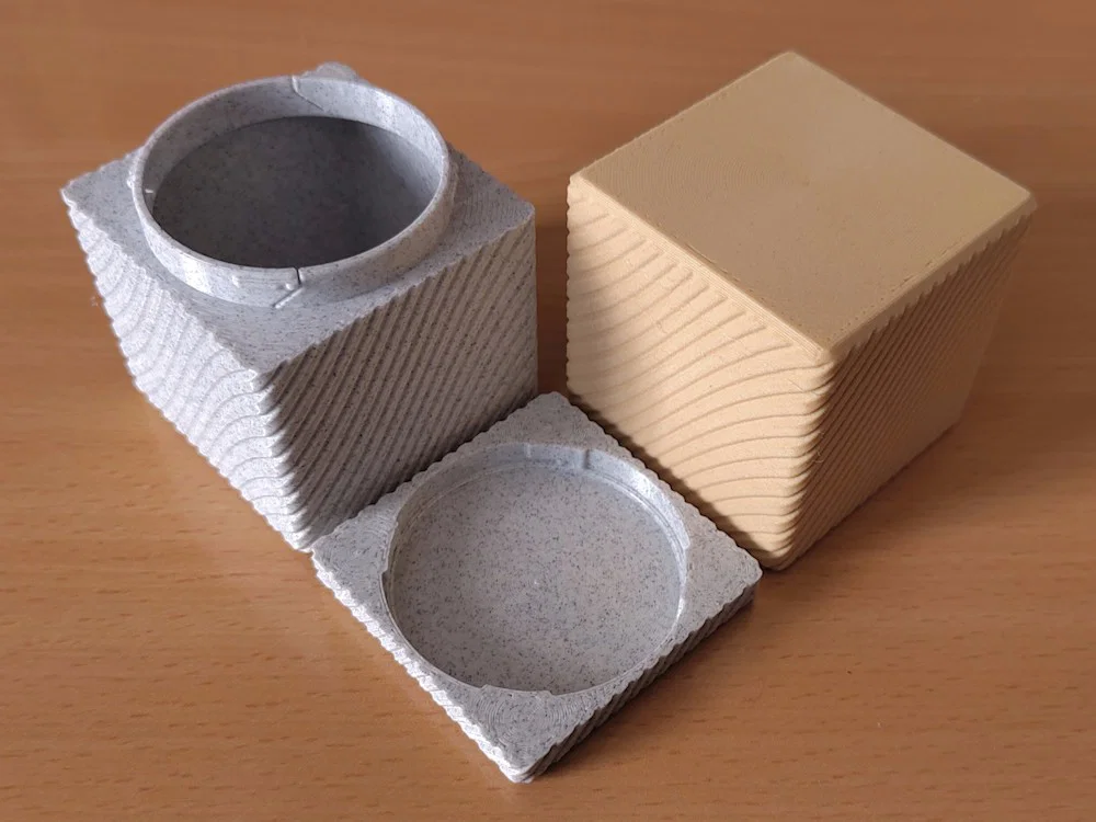Mẫu này về cơ bản là một lớp “skin” kiểu đá trong phim "The Fifth Element" cho square twist lock box. Mình chưa in thử nên hiện chỉ có render đơn giản, nhưng ở hình thứ hai bạn có thể thấy hộp square twist lock box ngoài đời trông như thế nào. Bên trái in bằng Prusament marble, bên phải in bằng Prusament woodfill linden. Dù nhìn và sờ khá thích, mình không khuyến nghị loại woodfill này vì nó thiếu độ “springy” cần thiết để tạo cảm giác click của khóa twist&click (bayonet lock).