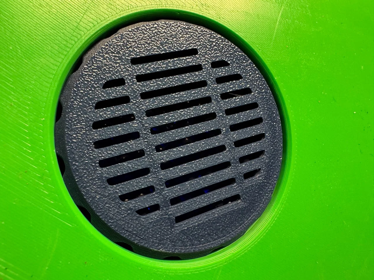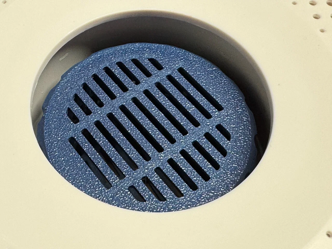 Hộp đựng hạt silica gel, kích thước được chỉnh để lắp kiểu pressure fit vào lỗ trục của cuộn filament Bambu tiêu chuẩn (ID 55mm) và đặt trong AMS. Mẫu này cũng vừa với các cuộn filament Bambu thay thế in 3D (xem hình cuộn màu xanh).