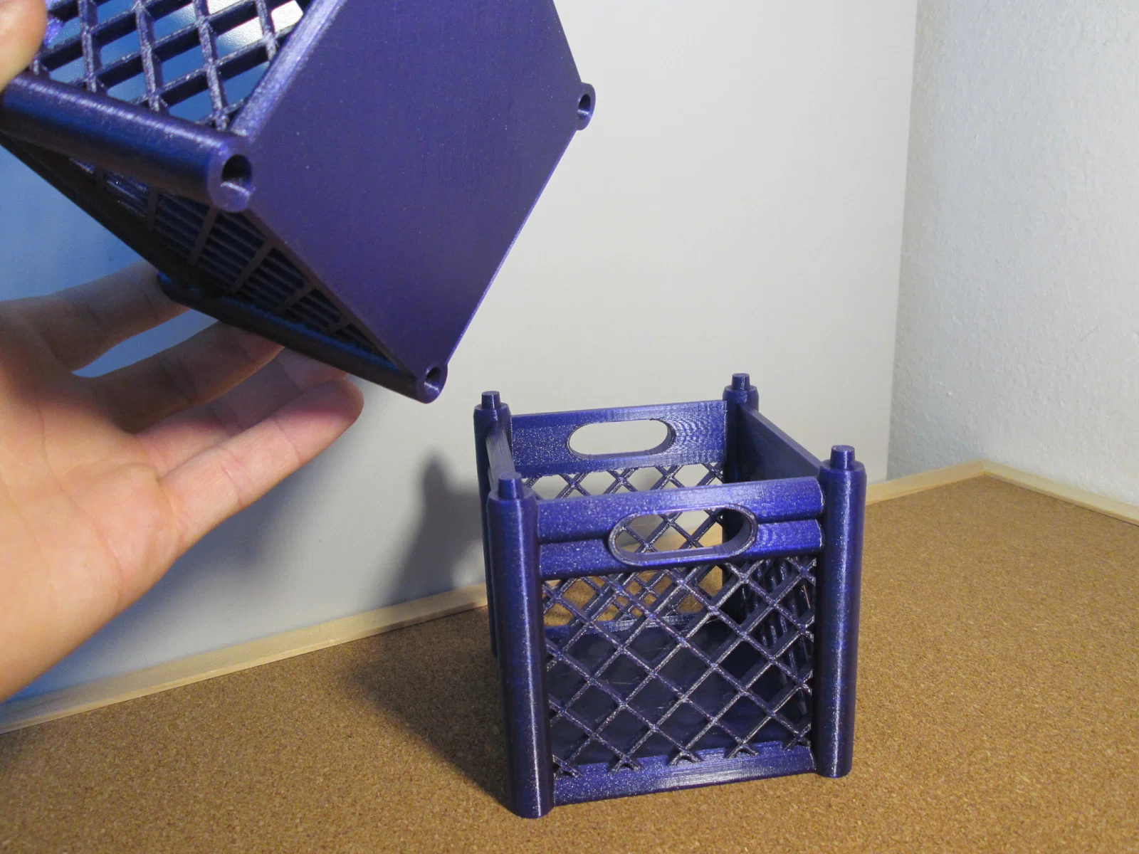 Crate là mẫu thùng/khay đựng đồ đơn giản, có 2 phiên bản: bản không lỗ xỏ ngón và bản có lỗ xỏ ngón (tiện khi muốn phóng to model). Kích thước trong 80×80×83, ngoài 100×100×96; in PLA/PETG.