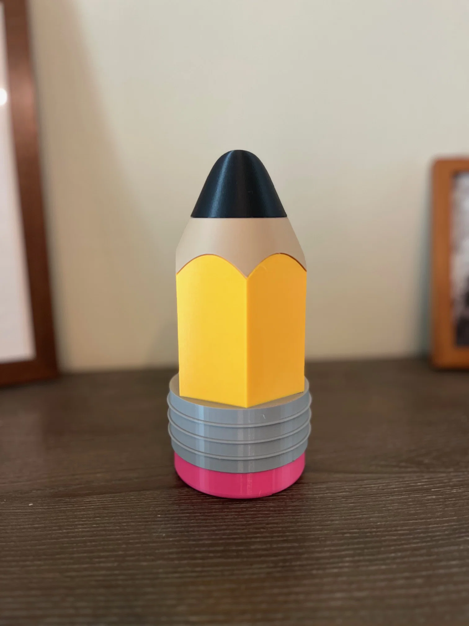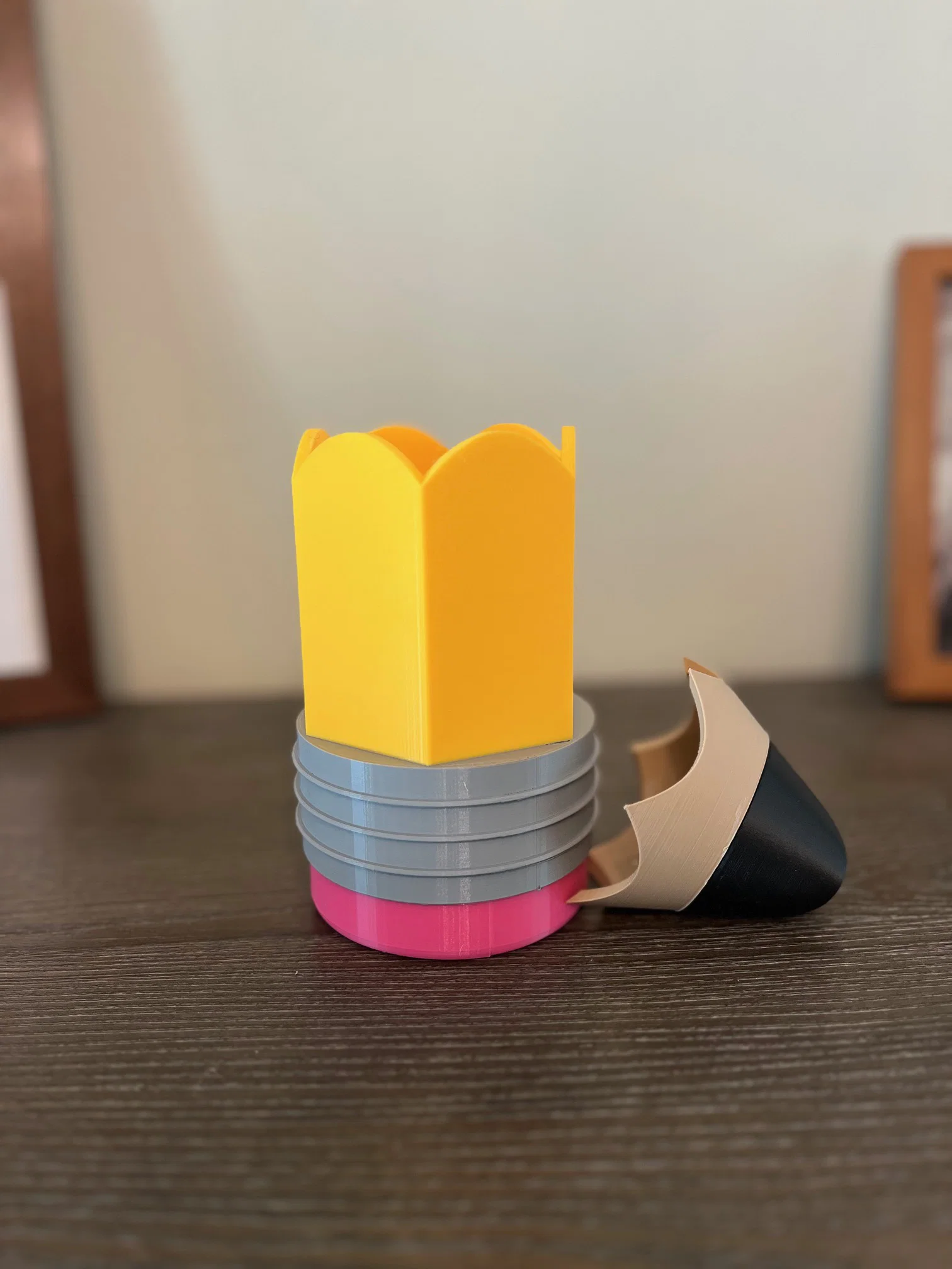 Ống đựng bút có nắp vặn, vừa để trưng bày bút/viết trên bàn làm việc vừa có thể nhét kẹo hay quà nhỏ bên trong. Rất hợp làm quà tặng cô giáo, kèm mẹo in và đổi màu theo layer.