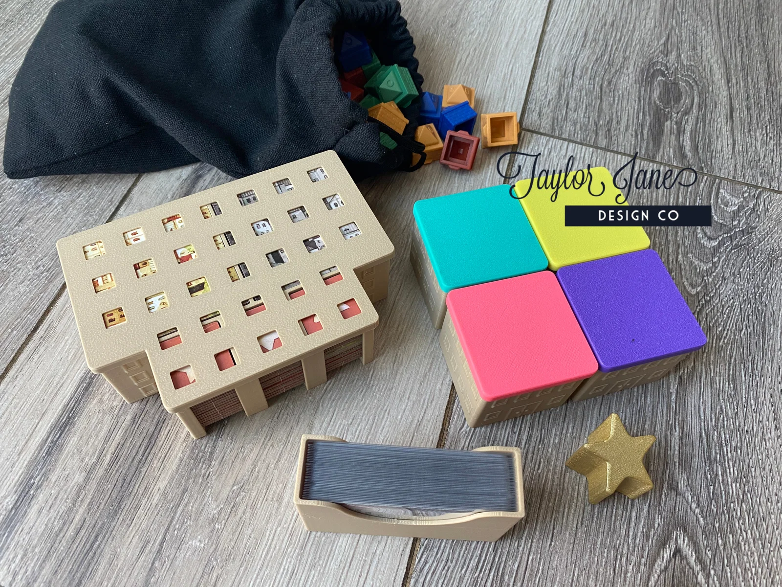 Organizer/insert dạng “thành phố” cho Cities (Phil Walker-Harding, Devir Games). In mỗi file 1 cái, riêng nắp hộp người chơi cần 4 cái; có thể chỉnh độ khít X/Y 0.1–0.2mm. Dùng được theo chiều dọc, hợp sleeve.