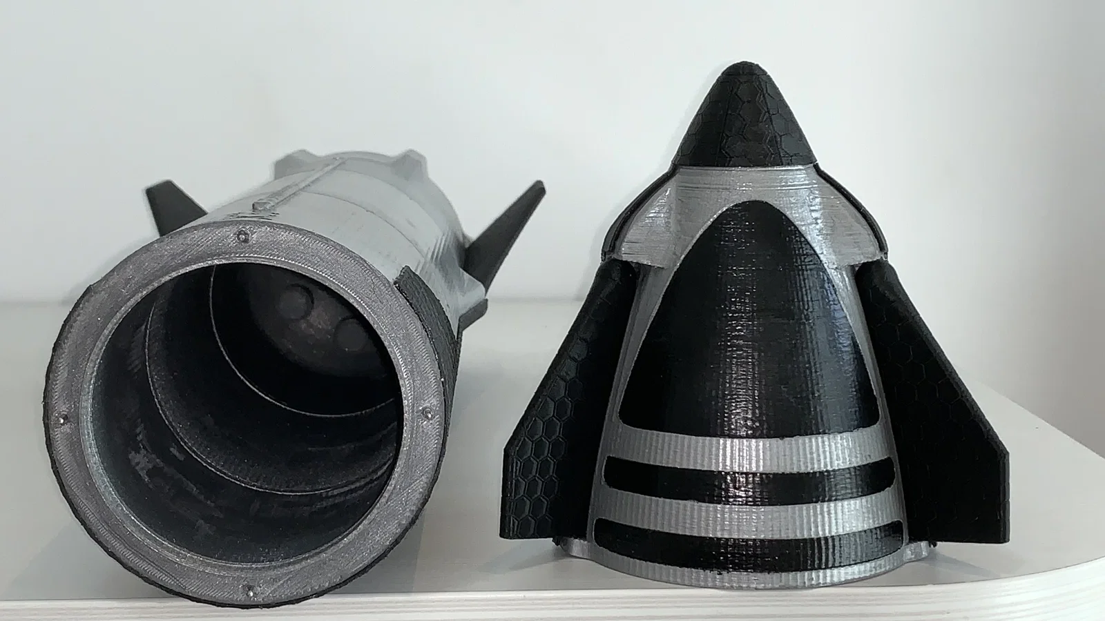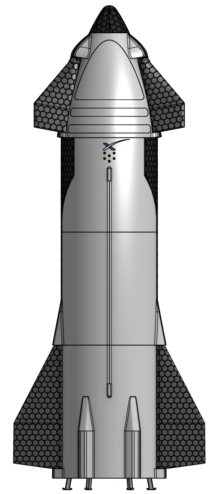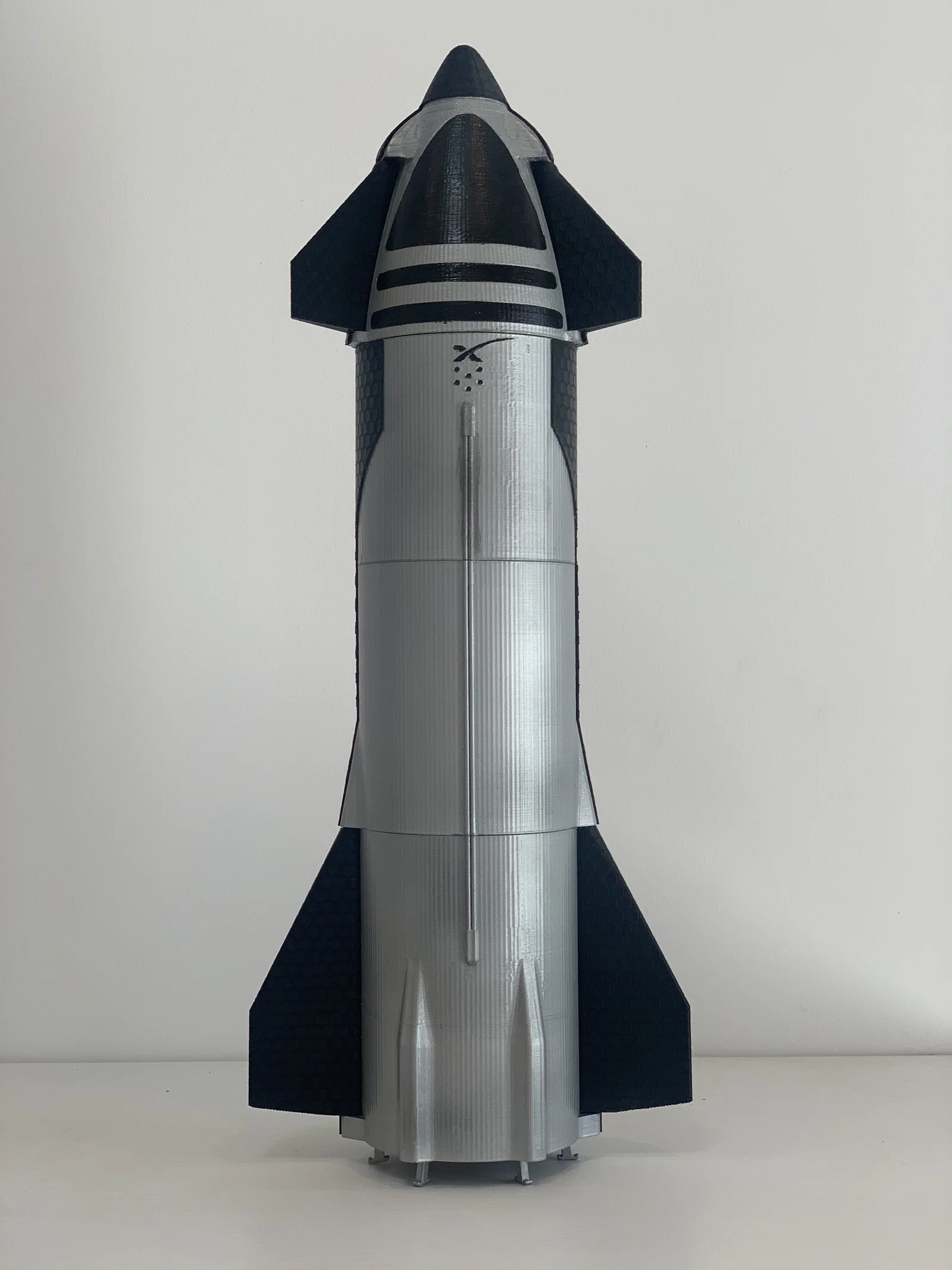 Mẫu SpaceX Starship tỷ lệ 1/100 cao khoảng 50cm. Bản đang chỉnh sửa heat shield, flaps, chân đáp và chi tiết engines/fuselage; cần 6 legs và 6 vacuum engines. Tối ưu in ít supports, heat shield dày 0.8mm.