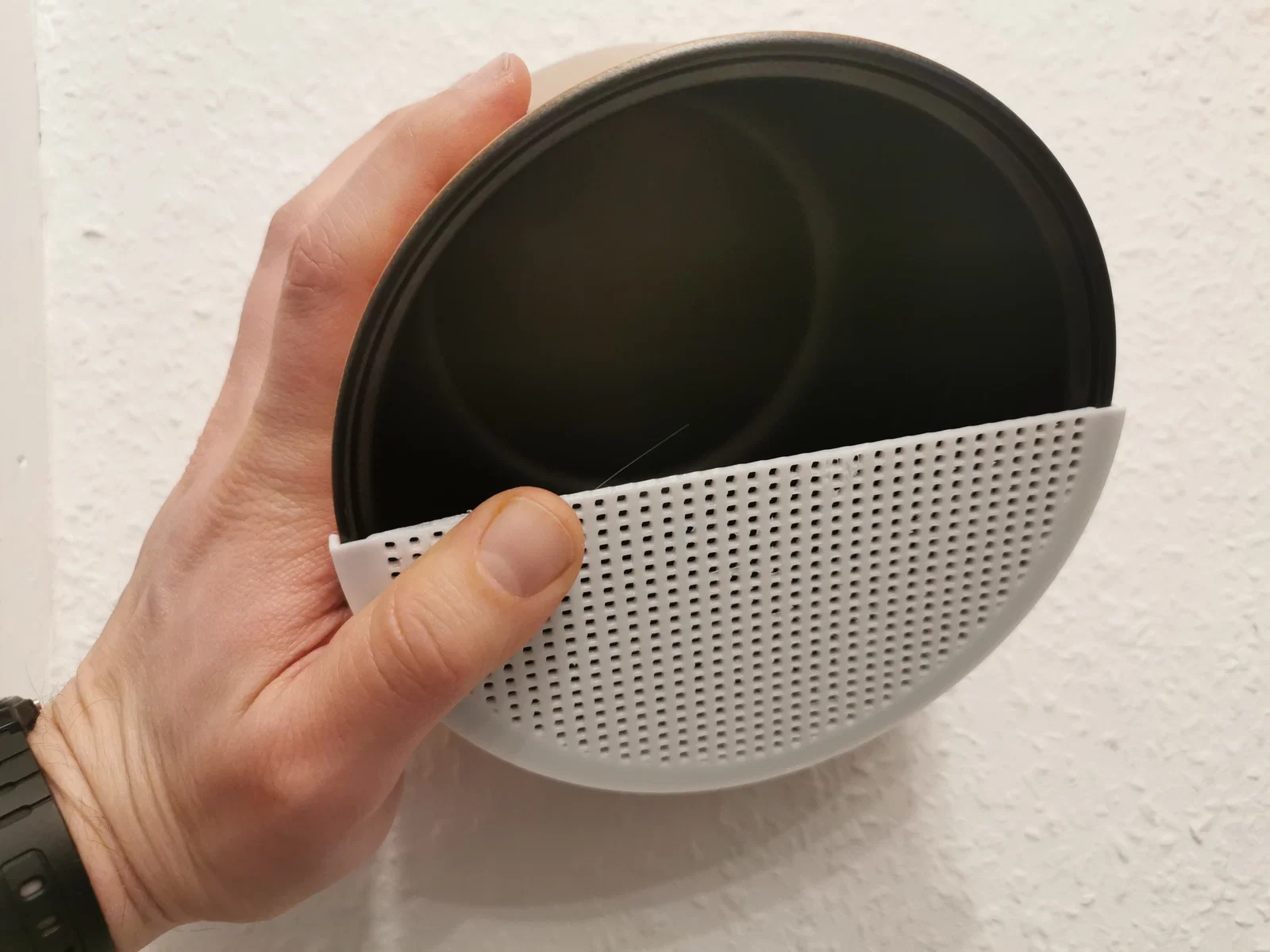Lòng nồi của mình có đường kính 14cm. Cái rây đặt vừa khít trên vành nồi. Các lỗ nhỏ đến mức gạo không bị kẹt, và nước có thể thoát hoàn hảo tới giọt cuối cùng.