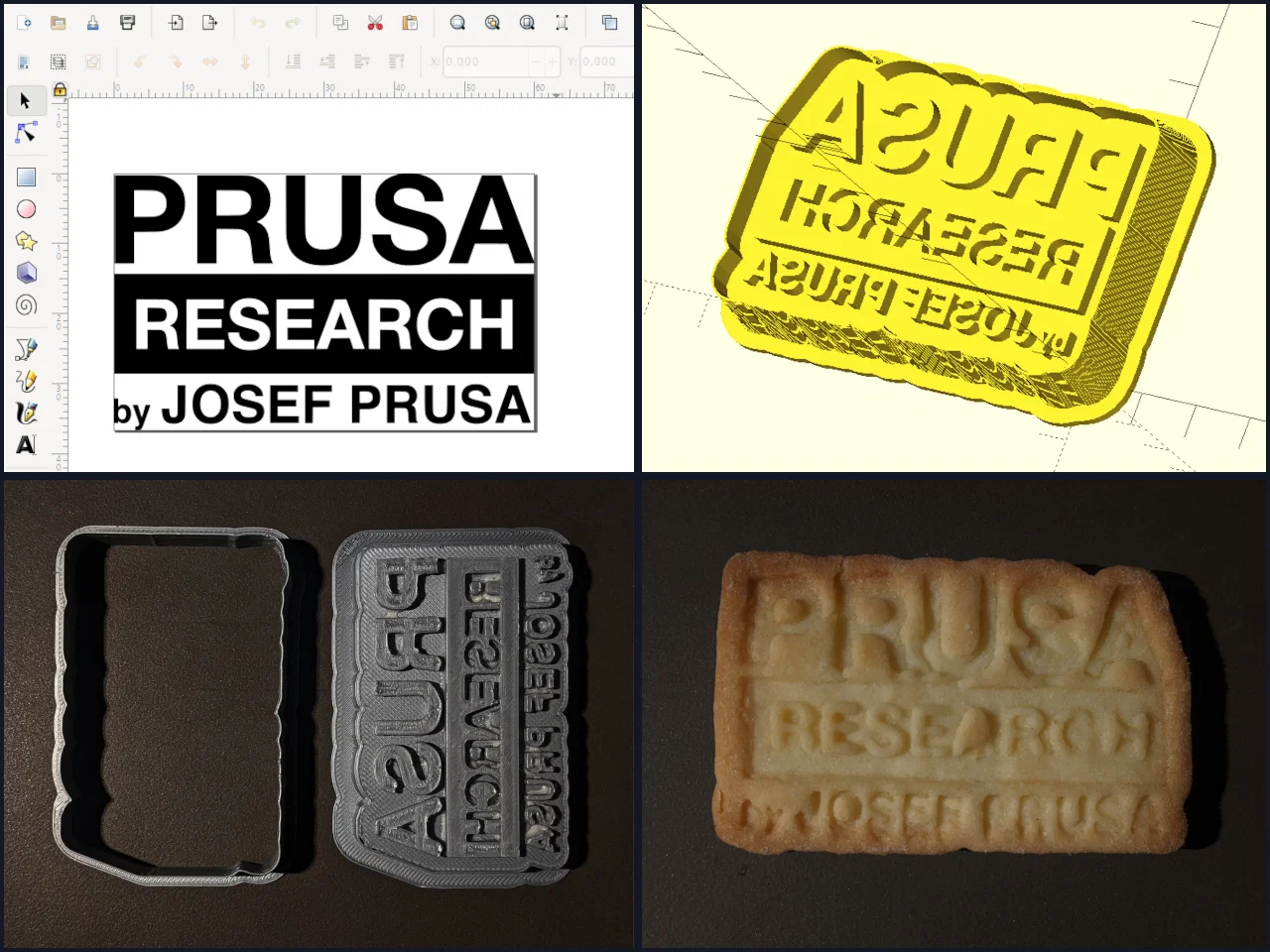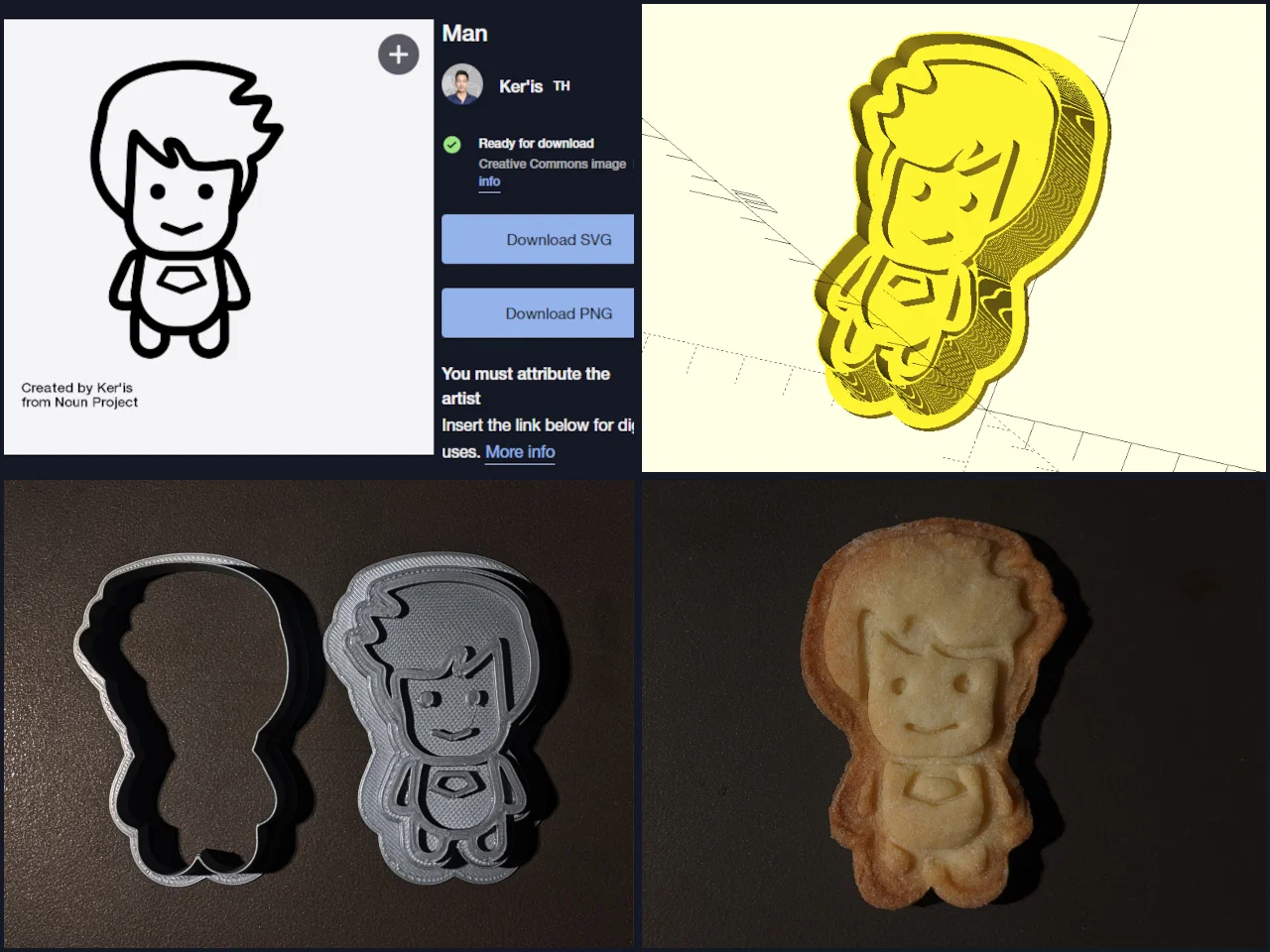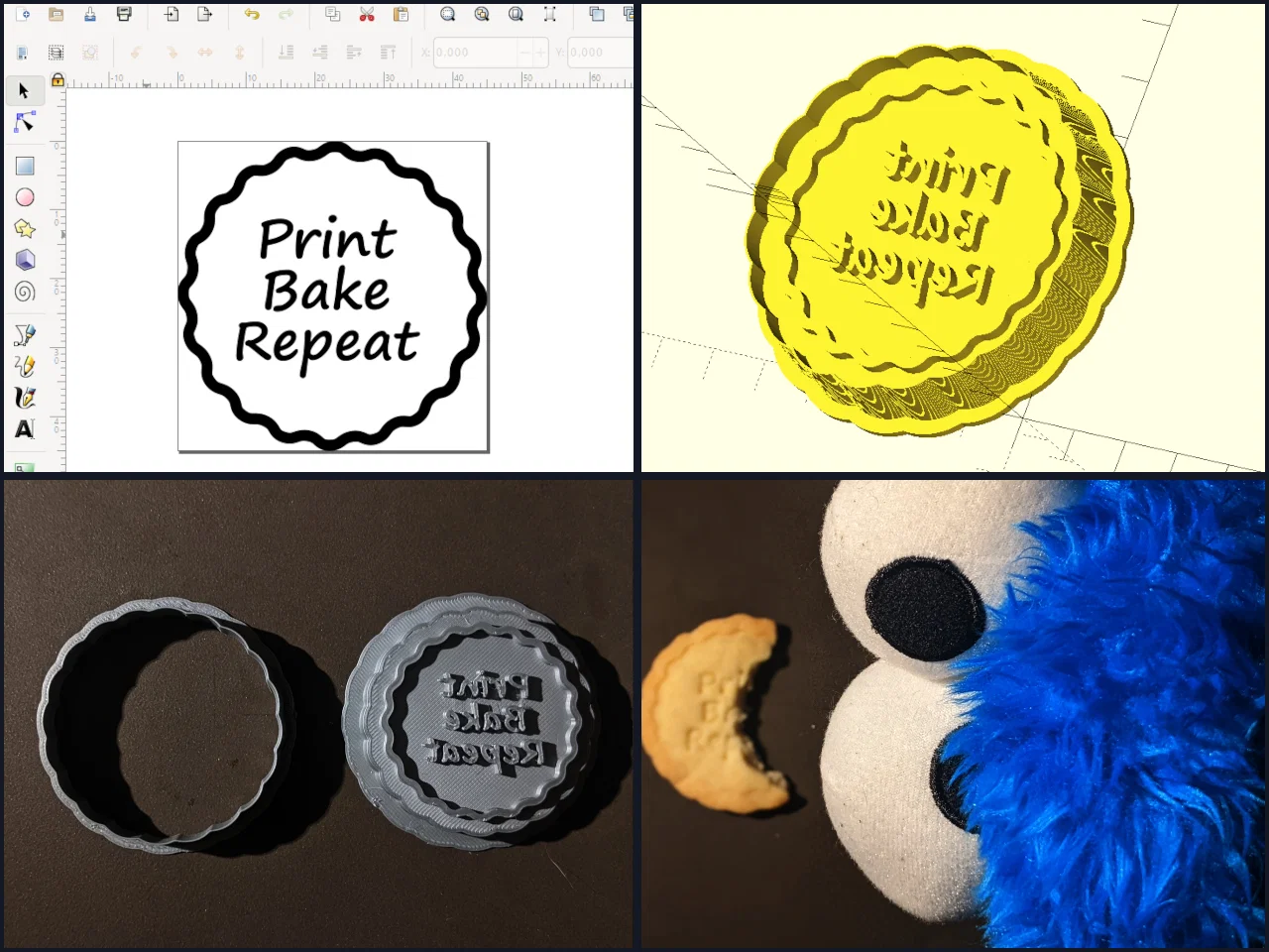 Tạo cookie cutter và cookie stamp từ bất kỳ hình đồ hoạ 2 màu nào (nhân vật, logo hoặc tên bạn). Chỉ cần SVG, Inkscape và OpenSCAD (>=2022.12) để xuất STL, rồi đem in và dùng cắt/dập bánh.