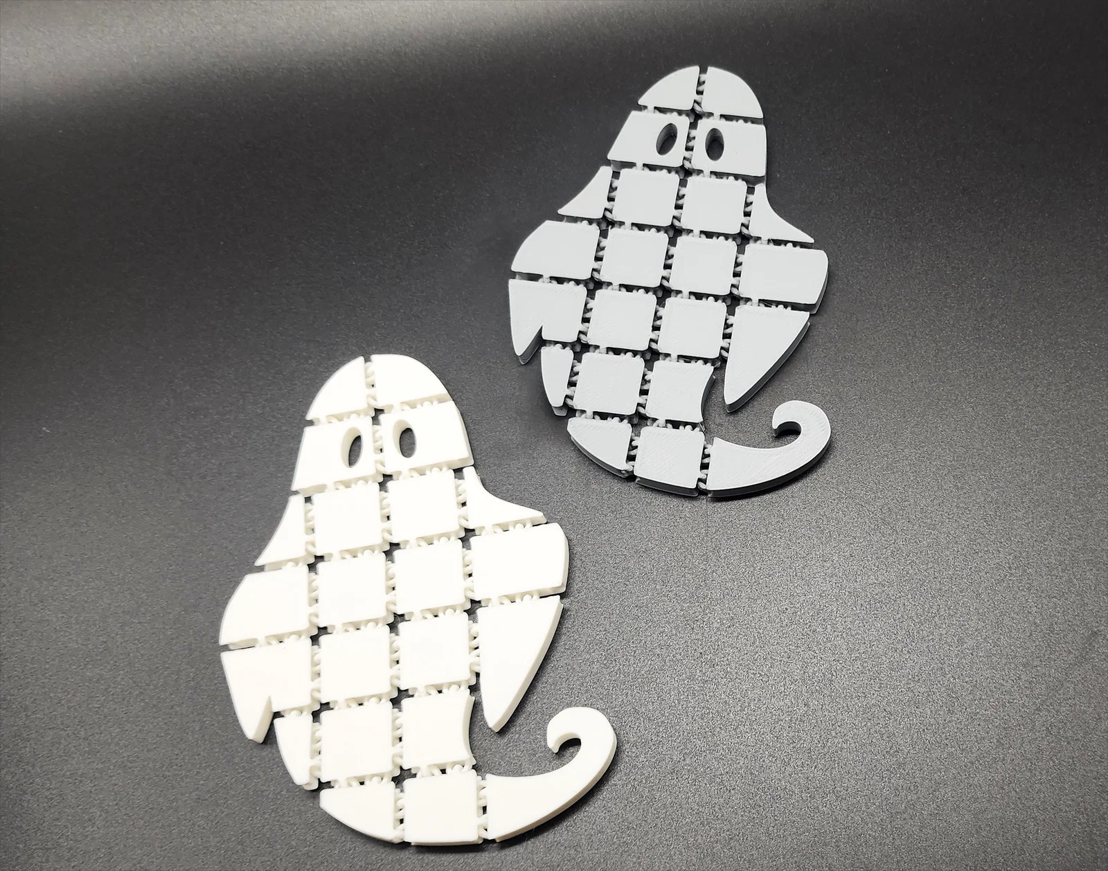 Mẫu Ghost thuộc bộ sưu tập Halloween flexible fabrics dạng print-in-place. Lưu ý không scale nhỏ, chỉ scale lớn. Nếu các khớp bị dính, thử tăng kích thước hoặc đổi filament để in mượt hơn.