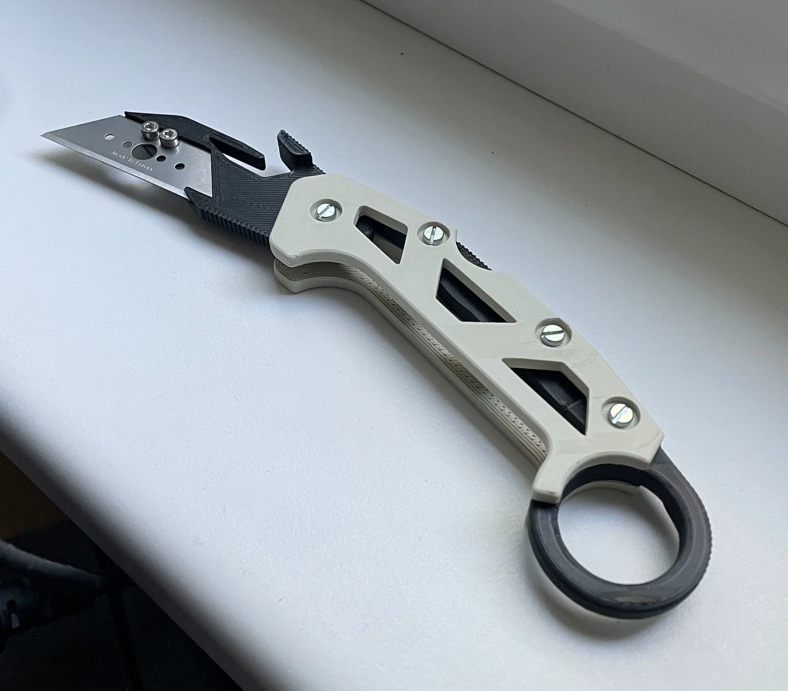 Bản remix SKELETON KARAMBIT FOLDING UTILITY KNIFE (OBERTECH NSP-02) với tay cầm mỏng hơn và có các rãnh cut-in. Karambit gấp có cơ chế khóa, kèm thông số in và phần cứng M3, dùng lưỡi trapezoidal 19 mm.