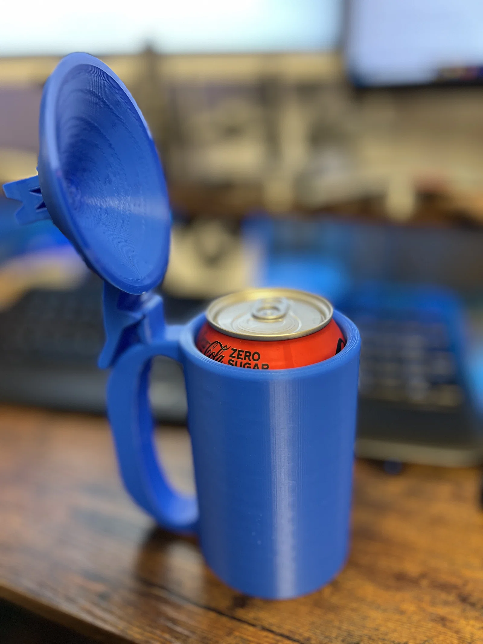 Mẫu ly stein để nhét vừa lon 12oz, giúp che kín lon bia/soda nhìn gọn và vui mắt. Có 2 bản: thẳng và taper. In thử trên Creality Ender3 V3 SE (nozzle .4mm, layer .2); nắp cần supports.