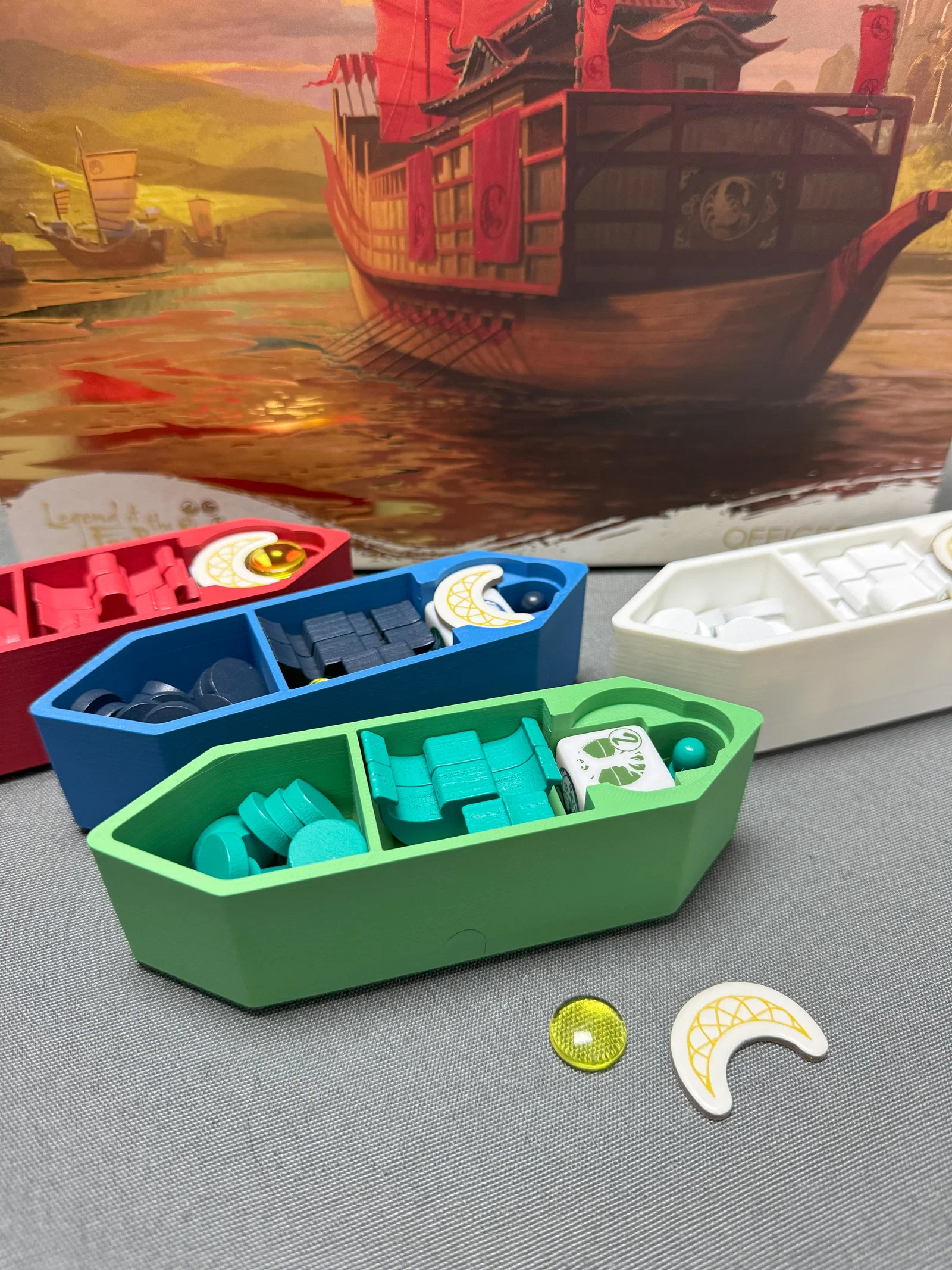 Bộ sản phẩm bao gồm các ngăn được phân chia thông minh để chứa tiền xu, các loại token chức năng và thẻ bài. Đặc biệt, các khay hình thuyền có màu sắc riêng biệt giúp người chơi dễ dàng nhận diện và phân chia quân bài hoặc linh kiện theo từng màu của người chơi một cách trực quan. Việc sử dụng các khay này không chỉ giữ cho linh kiện bền bỉ hơn, tránh thất lạc mà còn nâng cao trải nghiệm thẩm mỹ khi chơi, khiến bộ board game của bạn trông chuyên nghiệp và gọn gàng hơn hẳn so với việc để mọi thứ trong túi zip nilon thông thường.