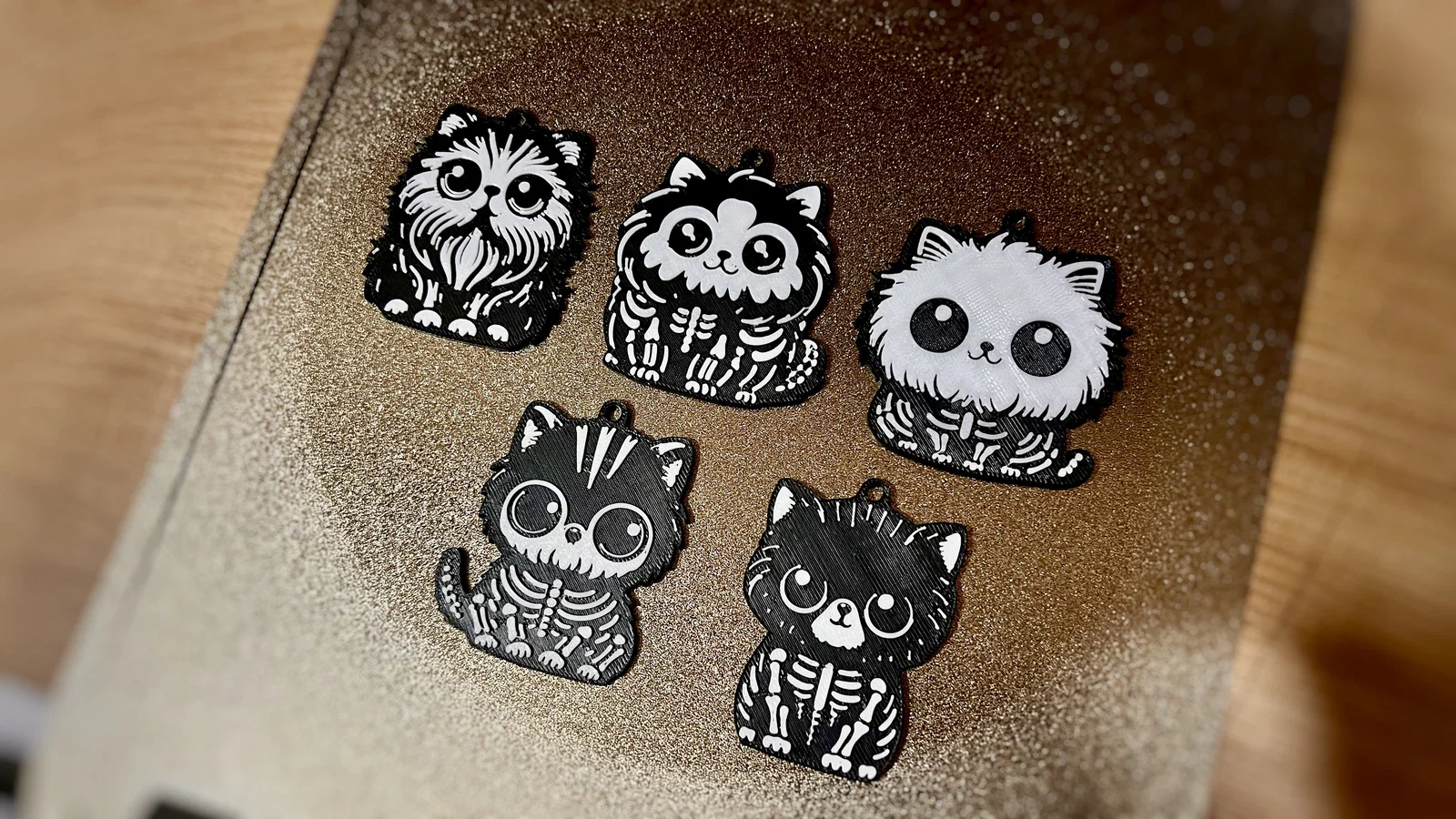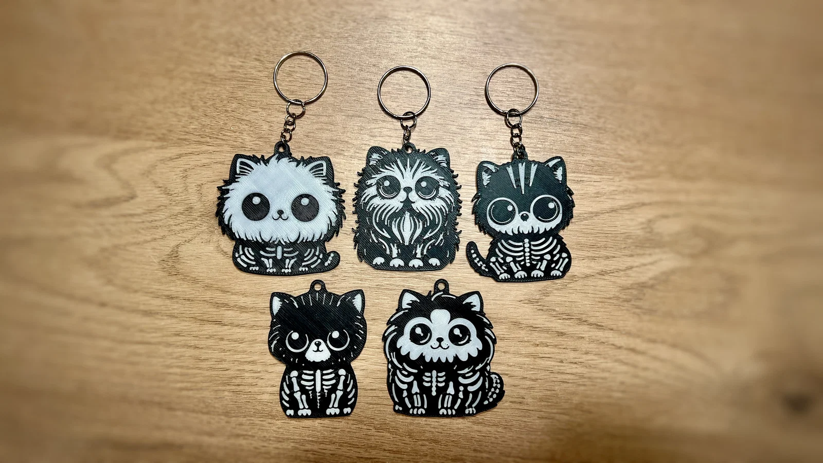 Bộ 5 mẫu móc khóa mèo Halloween phong cách skeleton. Hướng dẫn in 2 màu bằng cách pause ở layer 11 để đổi filament từ đen sang trắng, kèm khuyến nghị tốc độ, vật liệu PLA/PETG và infill 100%.