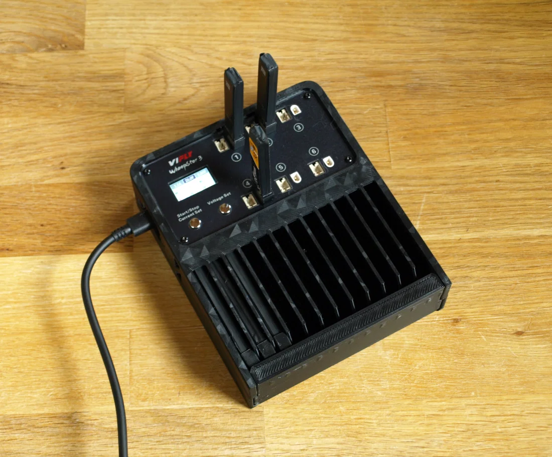 Hộp lưu trữ pin BT2.0 cho FPV: chứa 24 pin 1s 300mAh kèm Whoopstor v3, hoặc 12 pin 450mAh kèm Toothstore. In không cần support; lắp với ốc M3x8 và M3 insert chuẩn Voron.