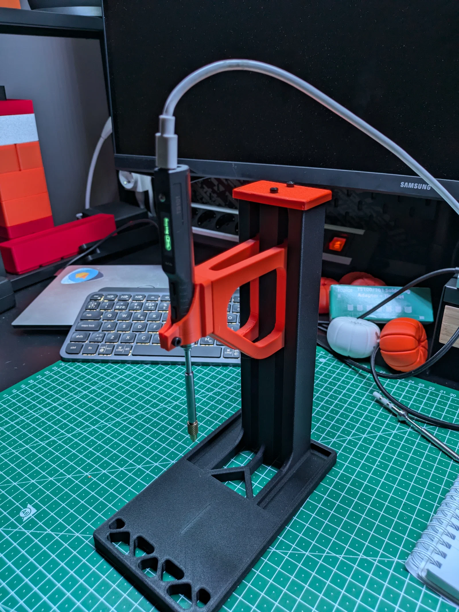 Nếu bạn là một người đam mê tự chế tạo các món đồ điện tử và thường xuyên phải lắp đặt các chi tiết ren đồng (heat set insert) vào nhựa in 3D, chắc hẳn bạn đã biết sự bất tiện khi phải giữ mỏ hàn bằng tay. Việc giữ mỏ hàn thủ công không chỉ gây mỏi tay mà còn khiến các chi tiết ren bị lệch, không thẳng đứng và gây mất thẩm mỹ cho bản in. Ngàm giữ chuyên dụng này được thiết kế đặc biệt để gắn máy hàn cầm tay TS100 hoặc TS101 vào bộ khung máy ép ren (Fully Printable Heat Set Insert Press), giúp quá trình lắp ren trở nên chính xác, chuyên nghiệp và an toàn hơn hẳn.