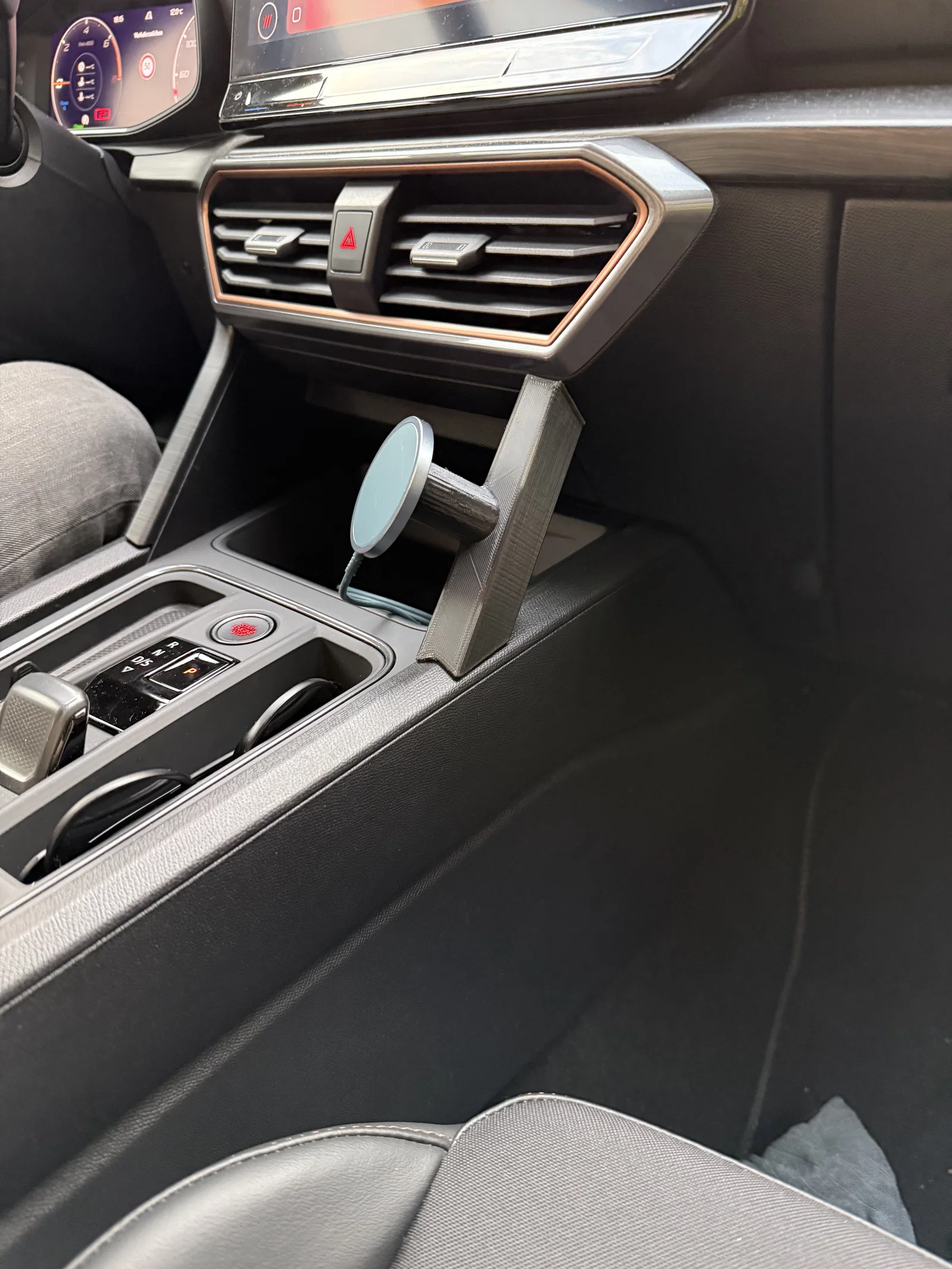 Mẫu phone mount/holder cho Cupra/Seat Leon 2020+ (Leon IV MK4), thiết kế gắn gần như liền với nội thất, không cần kẹp khe gió. Có thể dán MagSafe Charger bằng băng keo 2 mặt để giữ iPhone chắc chắn.