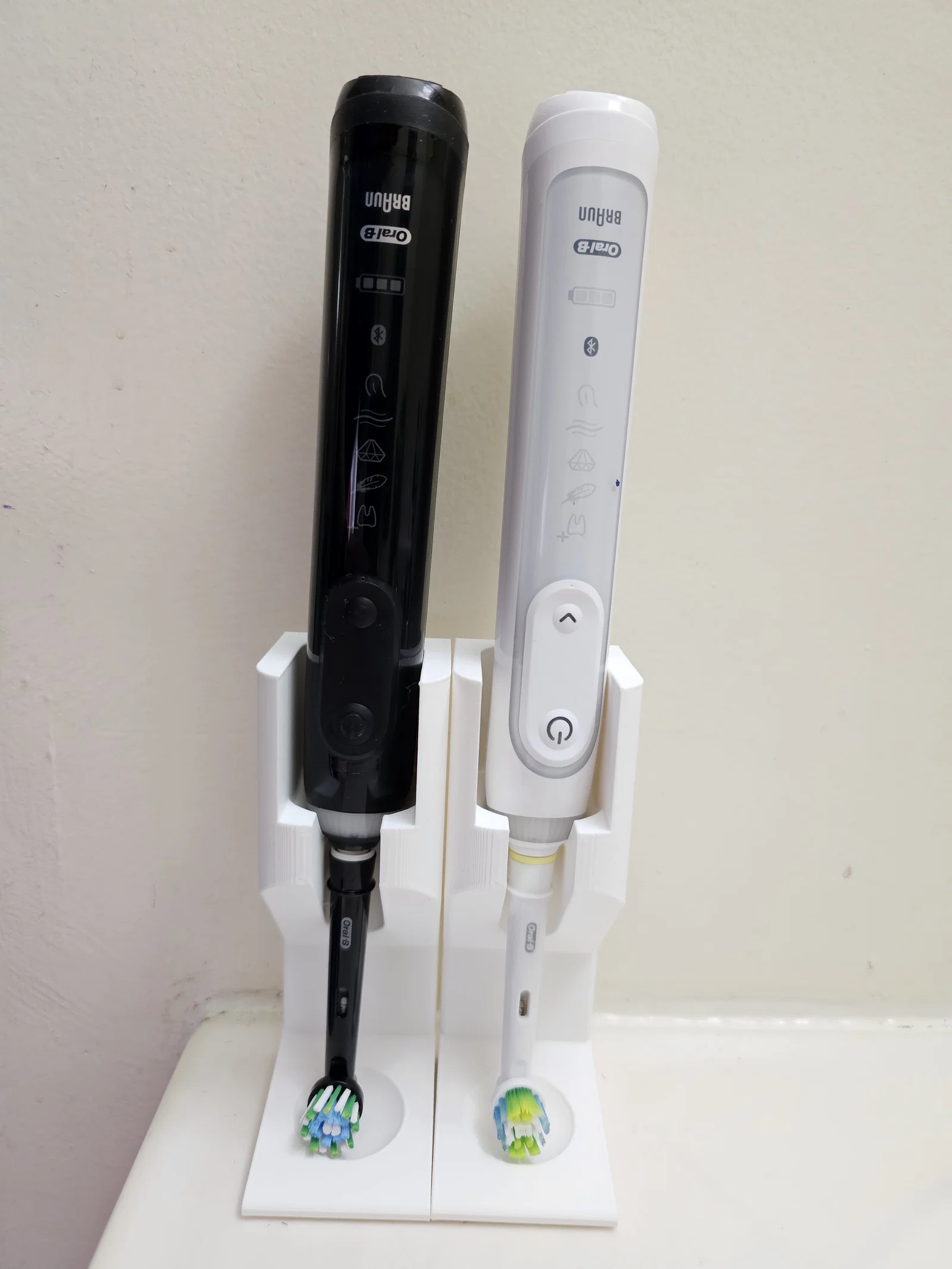 Giá đỡ giúp cất bàn chải điện theo kiểu úp ngược để hạn chế nước đọng ở phần ron dưới đầu bàn chải. Thiết kế cho phép in nằm lưng không cần supports, không cần gắn tường và có khay hứng nước nhỏ giọt.