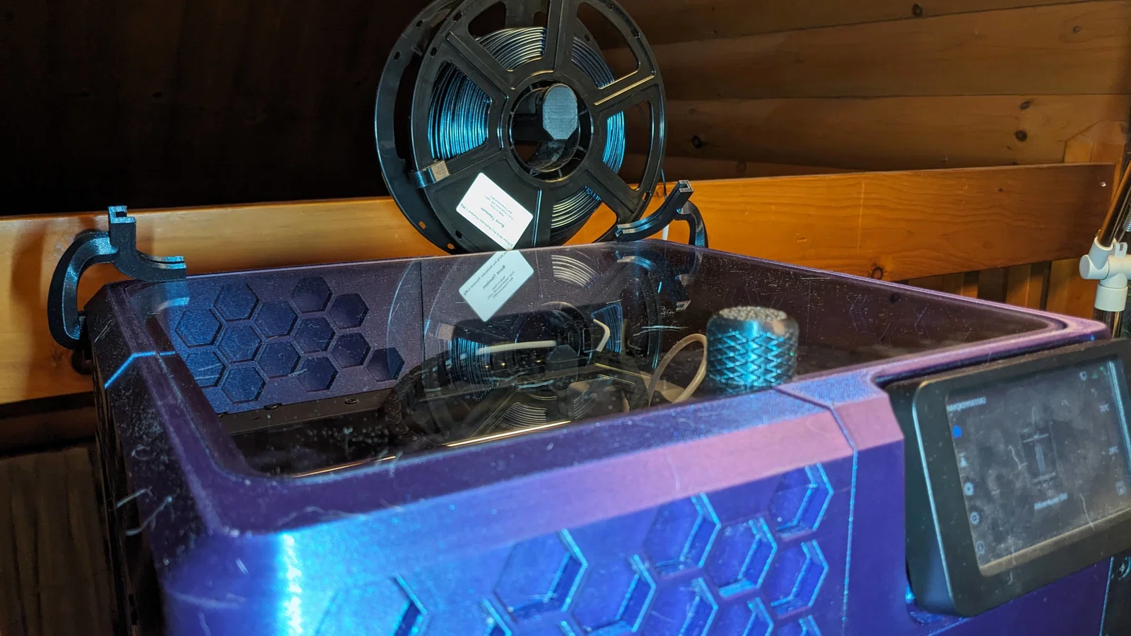 Phụ kiện holder giữ nắp trên AD5M ở góc 45°, tương thích bản remix enclosure ad5m dùng HSW cells. Gắn vừa các ô insert trống của HSW, có kèm file orientation cho Orca và lưu ý “Bridge infill direction”.