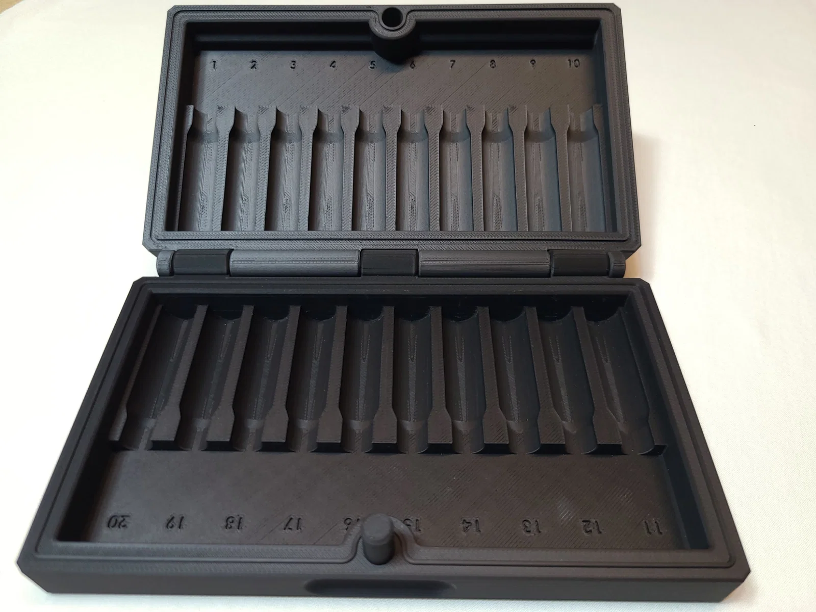 Đây là một hộp in 3D mình thiết kế để đựng 20 viên đạn .308. Các “silhouette” được đùn nổi lên hơi quá nửa chiều cao của viên đạn, giúp giữ chắc và tạo cảm giác “click” đã tay khi ấn viên vào. Hộp nên phù hợp với nhiều hãng hoặc kiểu đầu đạn, miễn là dùng vỏ .308 tiêu chuẩn.
