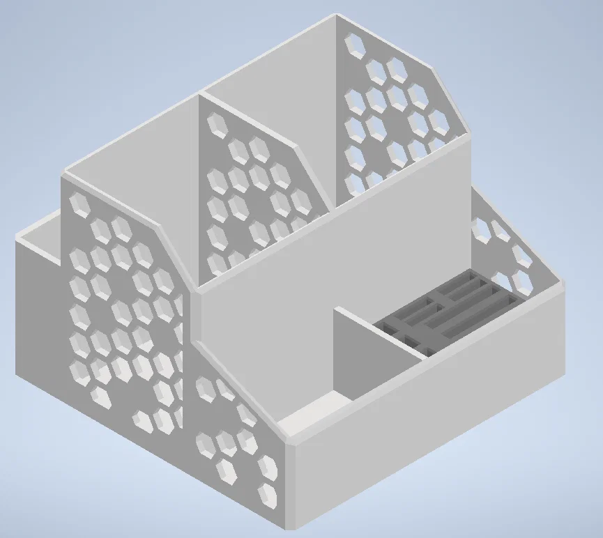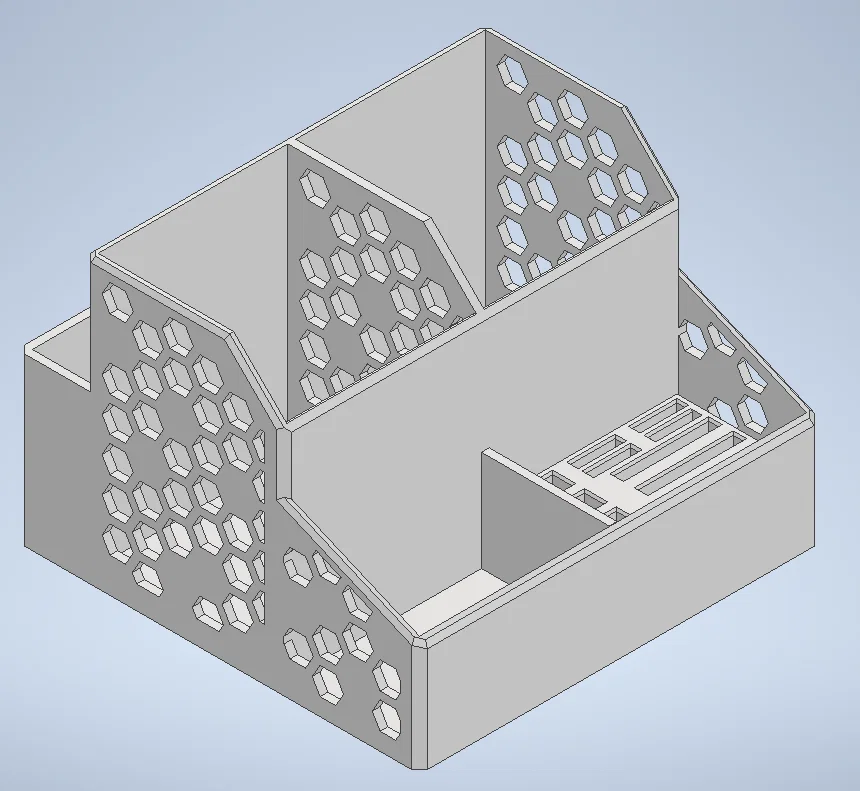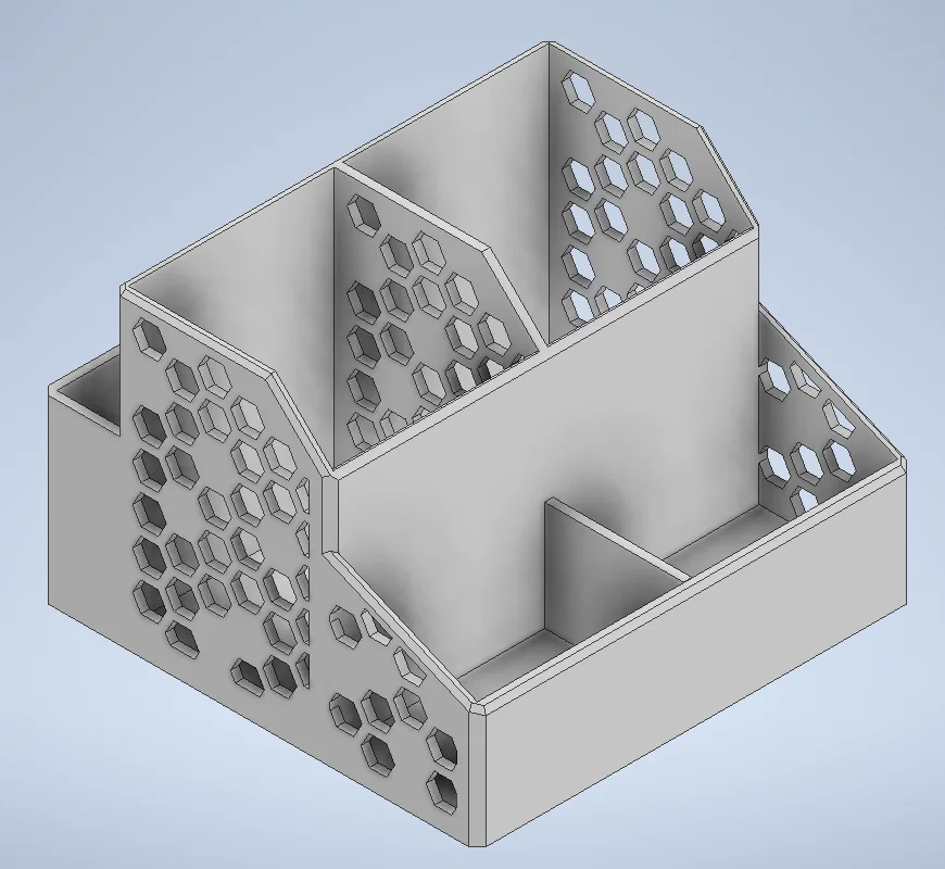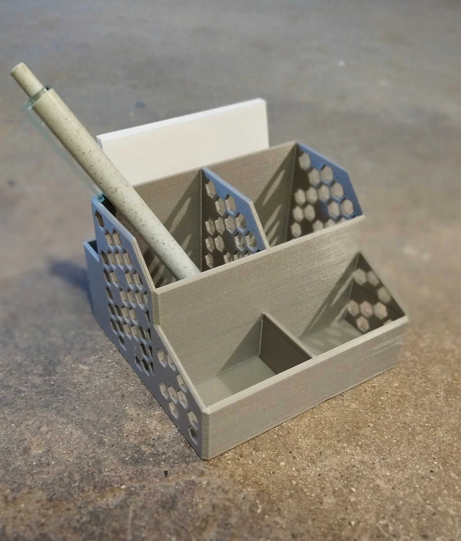 Sản phẩm được thiết kế với các ngăn phân chia thông minh, cho phép bạn để riêng biệt các loại vật dụng khác nhau. Các vách ngăn cao giúp đựng bút, thước hoặc các loại giấy ghi chú, trong khi các ngăn thấp phía trước cực kỳ tiện lợi để bạn để thẻ nhớ SD hoặc các thiết bị USB nhỏ gọn. Điểm nhấn đặc biệt của mẫu in này chính là họa tiết lỗ tổ ong (honeycomb) bao quanh, giúp thiết kế trở nên thoáng đãng, hiện đại và cực kỳ dễ in mà không cần đến vật liệu hỗ trợ (support).
