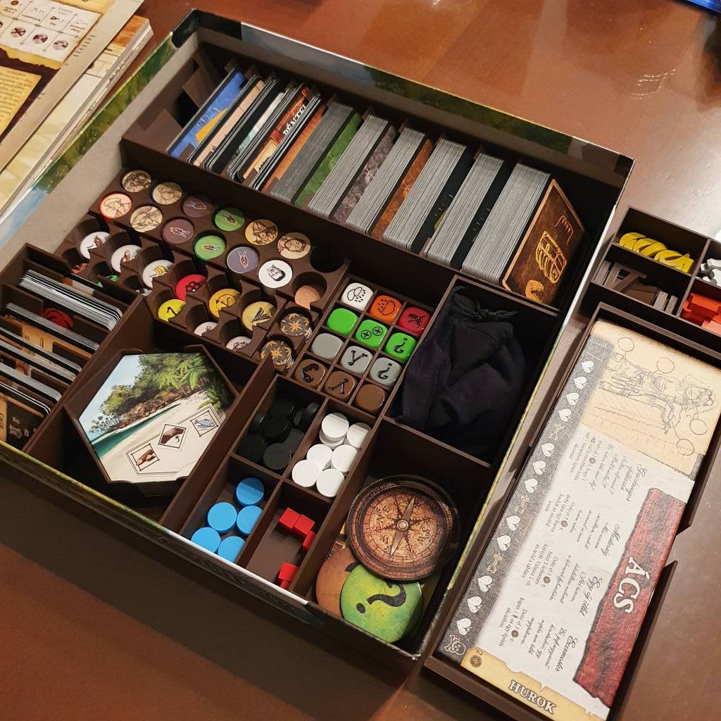 Nếu bạn là một người yêu thích bộ board game sinh tồn Robinson Crusoe nhưng luôn cảm thấy mệt mỏi với đống linh kiện lộn xộn trong hộp, thì đây chính là giải pháp mà bạn đang tìm kiếm. Bộ khay (insert) này được thiết kế để sắp xếp gọn gàng toàn bộ các thẻ bài, token và linh kiện nhỏ, giúp bạn tiết kiệm thời gian bày biện trò chơi để tập trung vào hành trình sinh tồn trên đảo hoang đầy kịch tính. Việc sử dụng insert không chỉ giúp hộp game nhìn chuyên nghiệp hơn mà còn bảo vệ các linh kiện của bạn khỏi bị hư hại khi di chuyển.