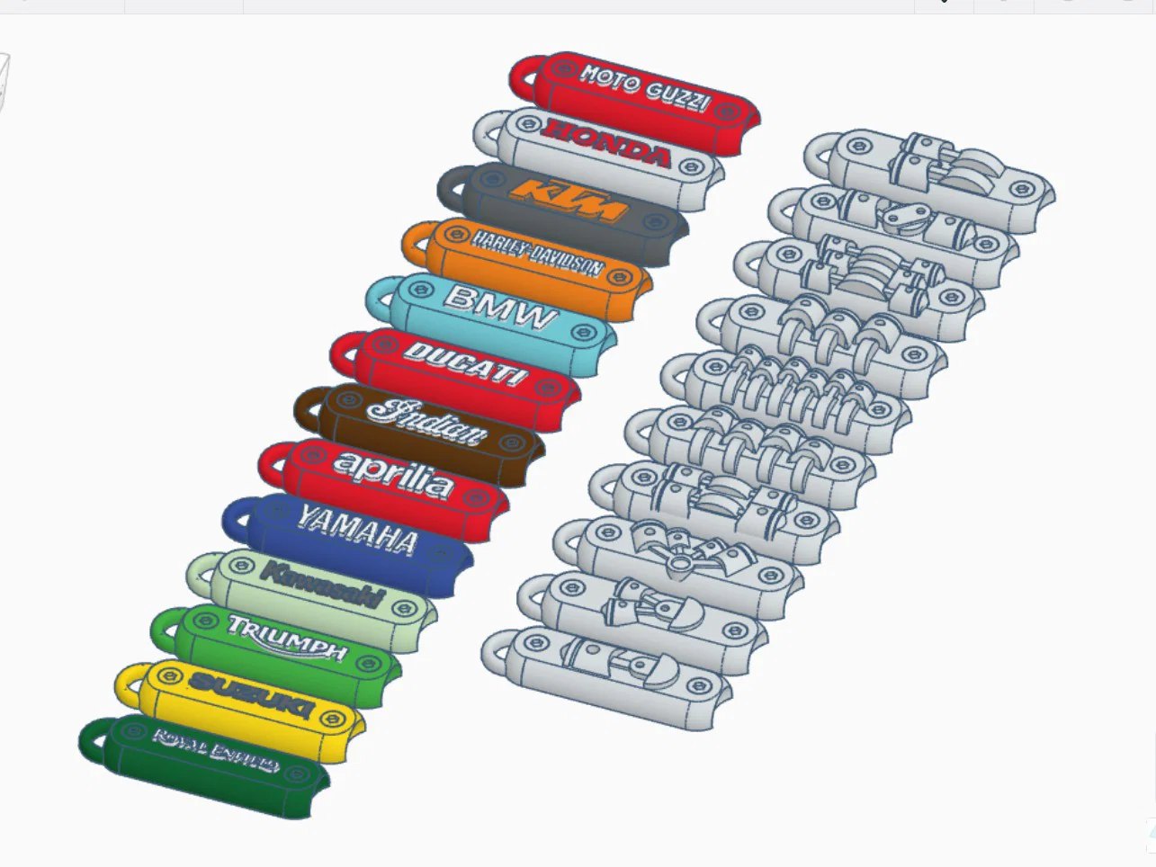 Tự tay làm chiếc móc khóa xe máy độc đáo của riêng bạn. Bộ sưu tập bao gồm 15 thương hiệu xe máy nổi tiếng và 10 cấu hình động cơ khác nhau để bạn thoải mái lựa chọn và in ấn theo ý thích.