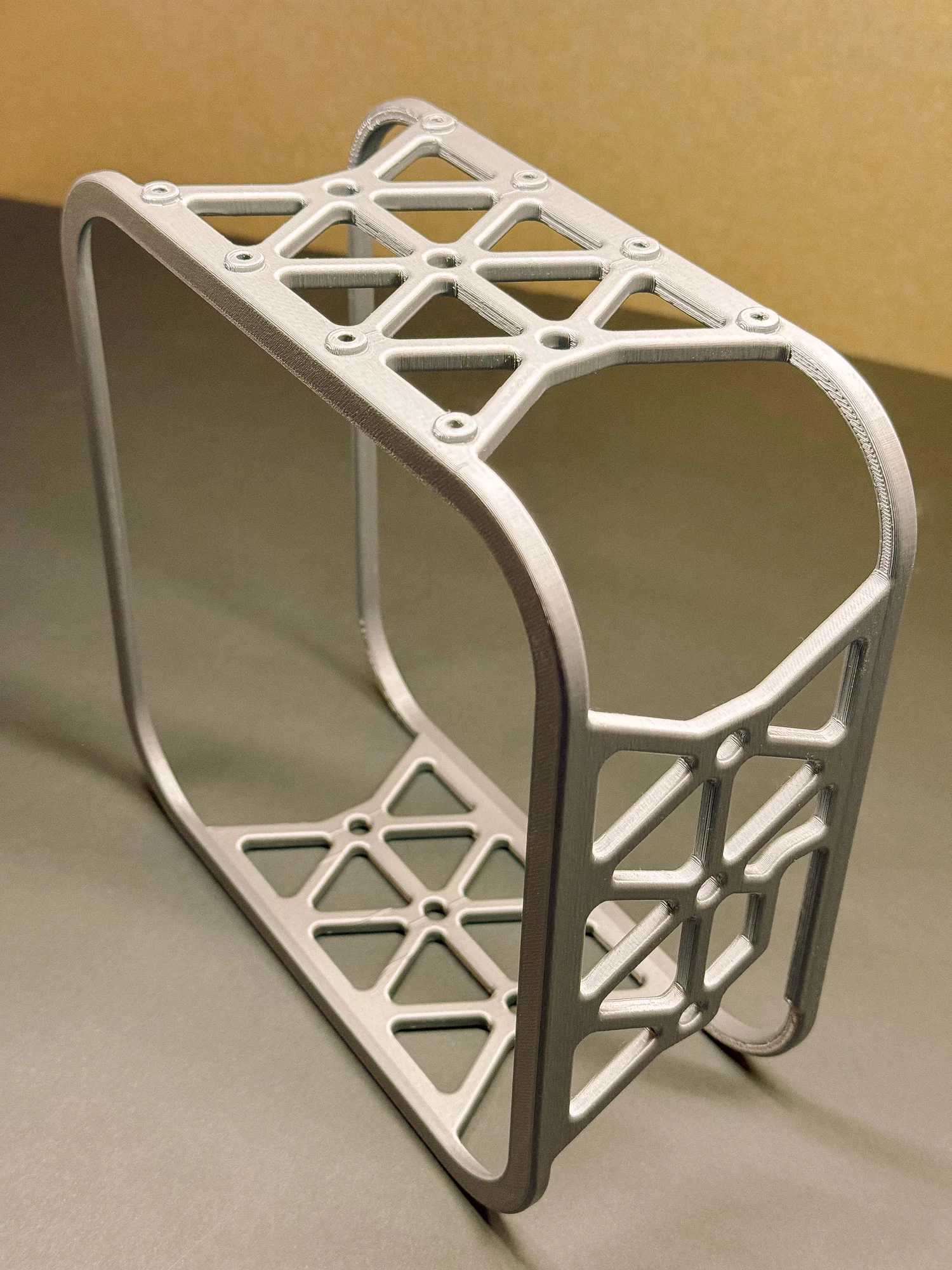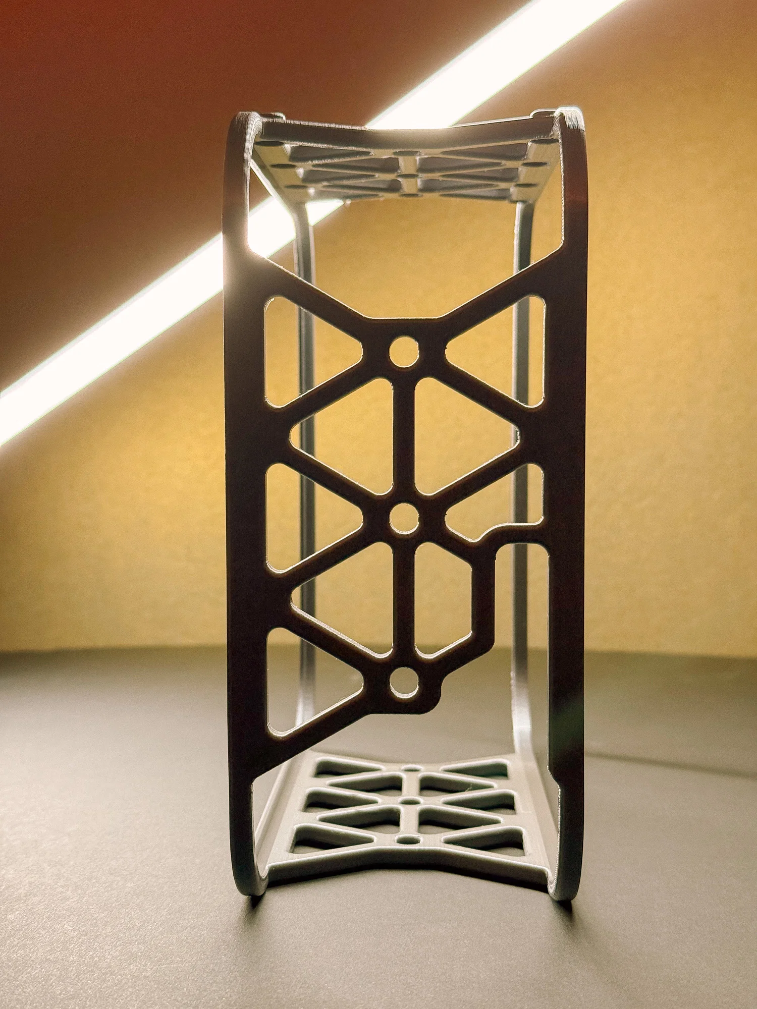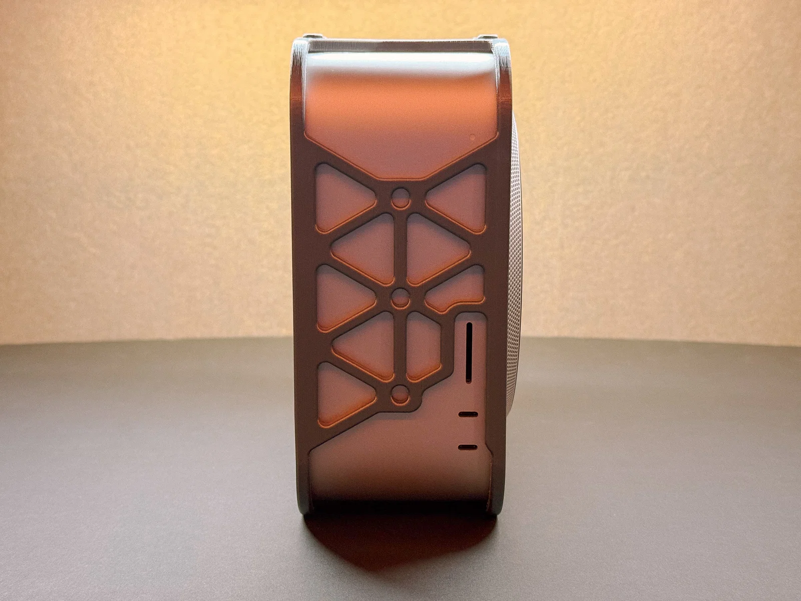 Cái cage được thiết kế để vừa bền vừa tiết kiệm filament, đồng thời vẫn cho phép truy cập thoải mái tất cả các cổng, gồm cả khe SD-card phía trước và các cổng USB-C. Thiết kế dạng dựng đứng cũng giúp luồng gió tốt: hút gió vào và xả quạt phía sau không bị cản.