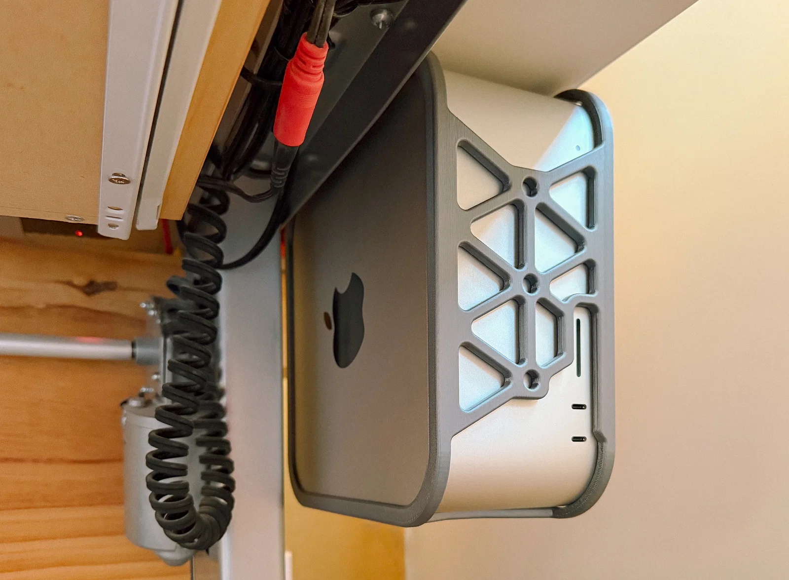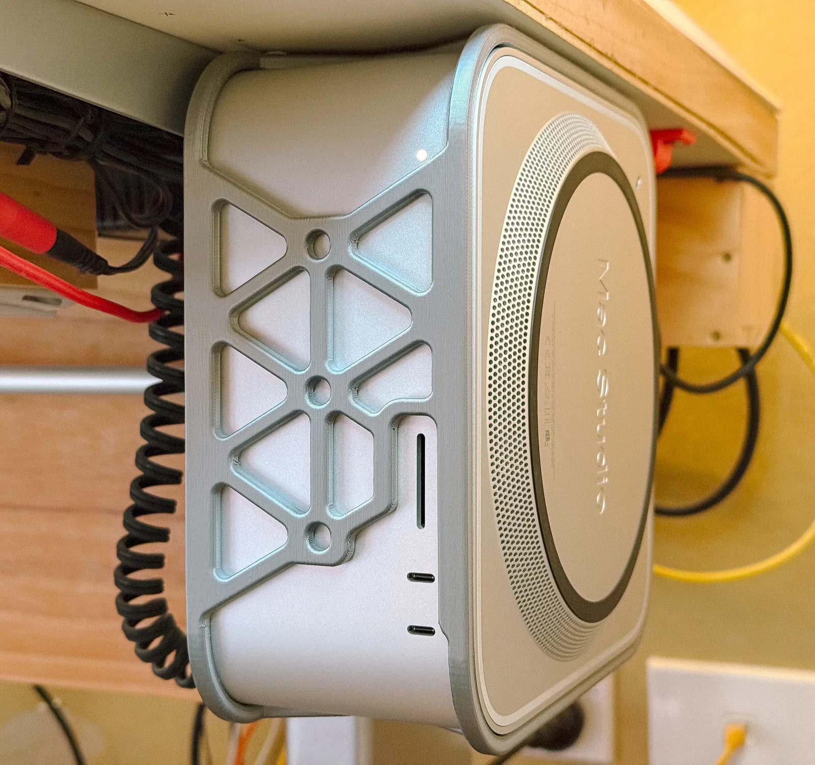 Thiết kế “cage” ôm sát giúp treo Mac Studio dưới gầm bàn, gọn gàng mà vẫn thoáng gió và không che các cổng (SD card, USB-C). Có 8 lỗ vít counter-sunk; in PLA, gợi ý 40% infill và dùng snug-supports.