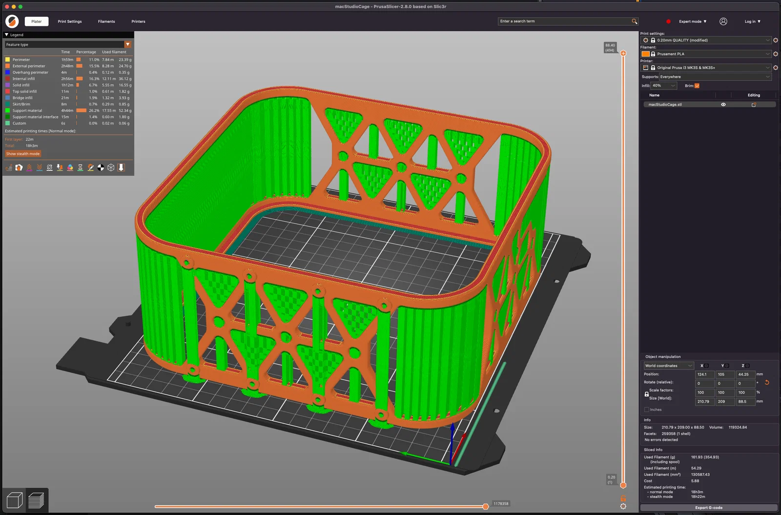 Mình in bằng Silver PLA Prusament với layer height 0.2mm (Quality). Kết quả là mất khoảng 18 tiếng, gần như không cần dọn nhiều hay gỡ support quá cực.